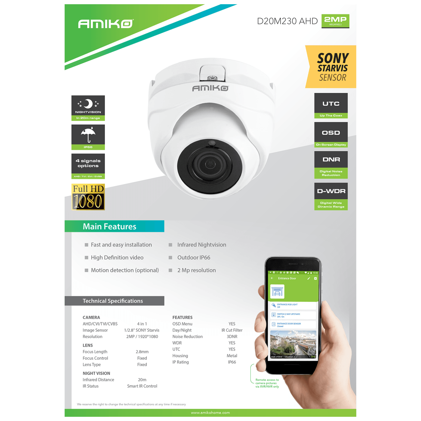 Amiko Home Kamera 2 MP, 1/2.8″ SONY Starvis CMOS, HD Lens 2,8 mm – D20M230 AHD