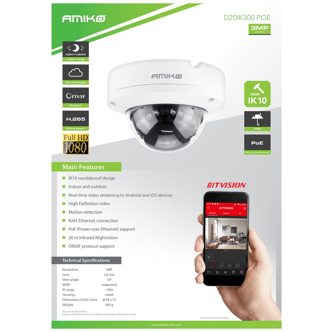 Amiko Home Kamera IP 3 MP, PoE, 1/2.8″ CMOS, 2.8mm, IK10 – D20IK300 POE