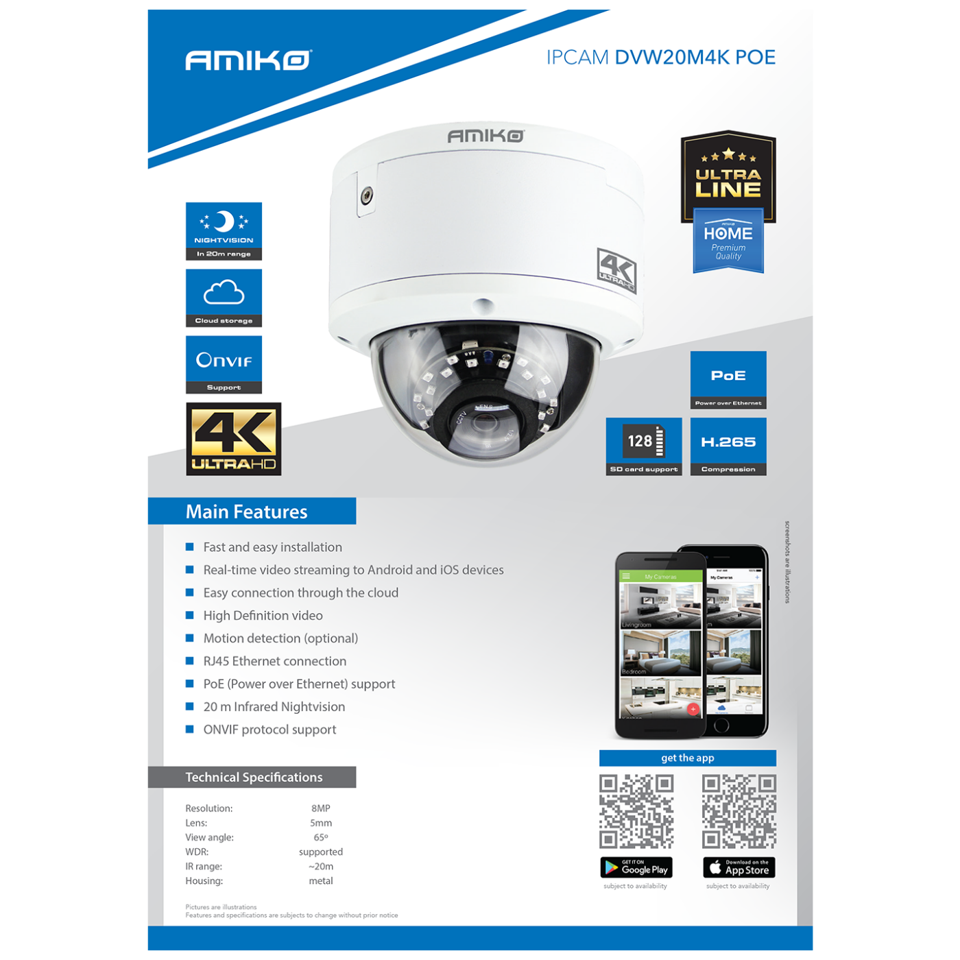 Amiko Home Kamera IP 8MP, 4K, SD utor, Lens 5mm, IR20 – DVW20M4K POE