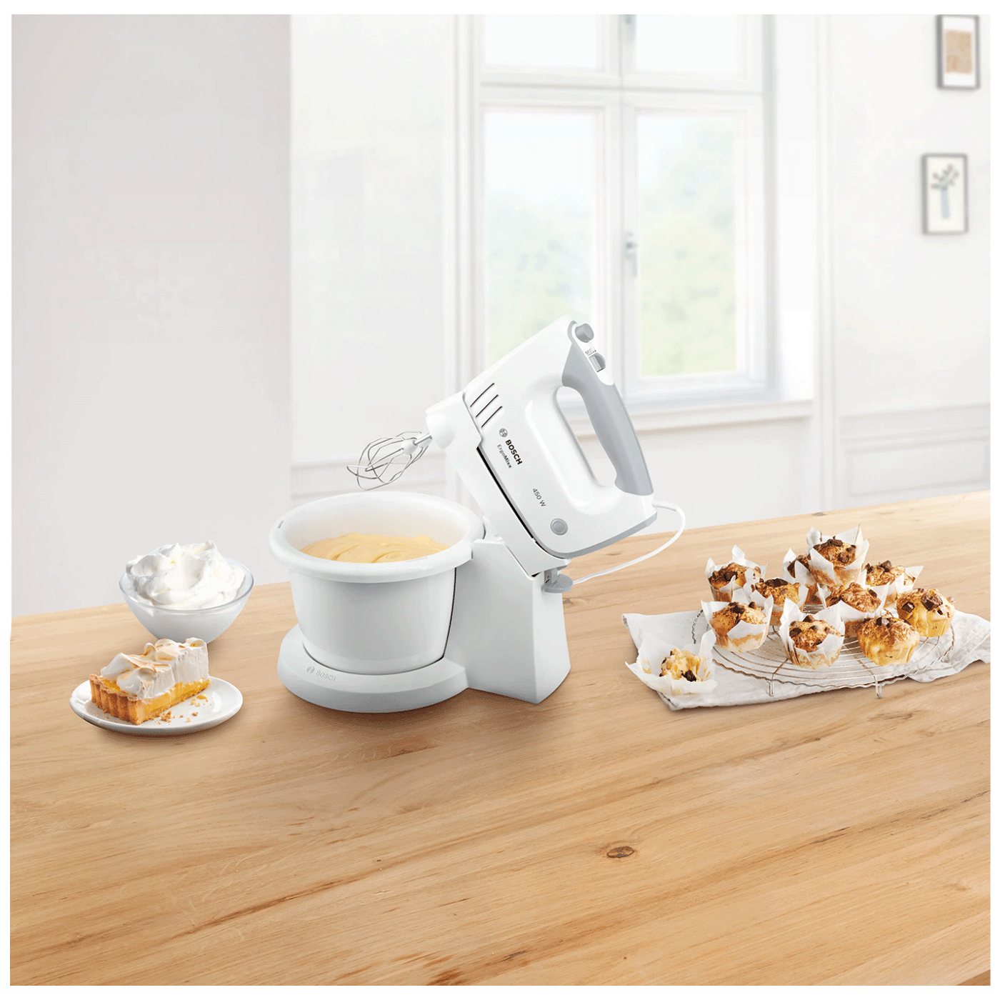 Bosch ErgoMixx MFQ36460 je svestran kuhinjski ručni mikser s misom i rotirajućom bazom koji olakšava pripremu smjesa za pečenje, miješanje, pjenjenje i čak mijesenje lakših tijesta bez potrebe da držiš mikser u ruci. Opremljen je moćnim motorom od 450 W koji omogućava stabilan rad, dok 5 brzina plus Turbo/Pulse funkcija pružaju preciznu kontrolu prema receptu. Uz mjeseću posudu od oko 3 l i ergonomsku “soft-touch” ručku, mikser nudi udobno i praktično rukovanje i pri dužem radu. U kompletu dolaze 2 turbo metlice od nehrđajućeg čelika za miksanje i 2 profesionalne kukice za mijesenje, a posebna baza i rotirajuća posuda omogućavaju hands-free rad kad je potrebno. Originalni pribor je dizajniran tako da se lako koristi i čisti.