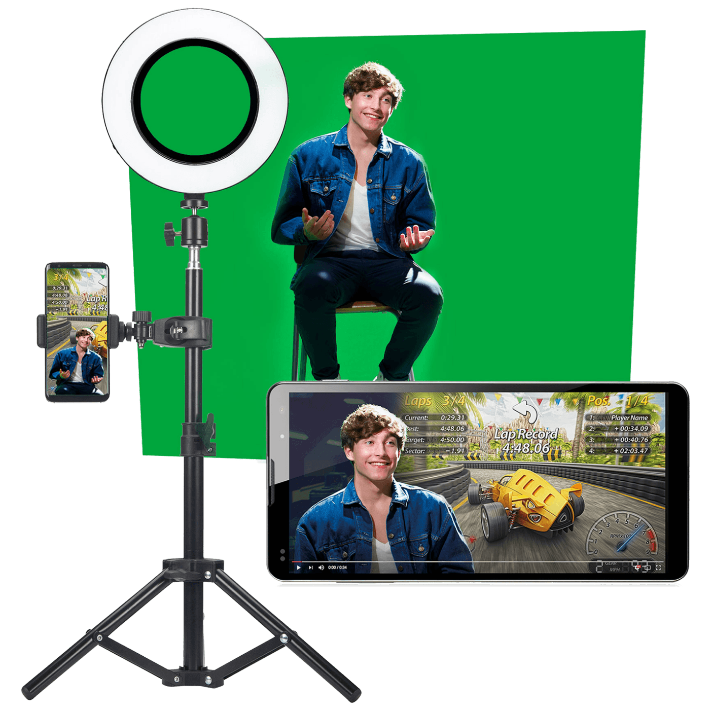 Studio komplet sa zelenim ekranom, stativom sa držačem za pametni telefon, mikrofonom i video svjetlom