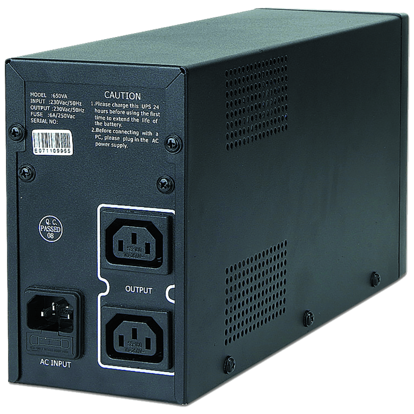 Ulazni napon: AC 162 – 295 V, 50 Hz / 60 Hz ± 10 %, izlazni napon AC 188 – 254 V, 50 Hz / 60 Hz ± 0.5 % ( baterija ), vrijeme prebacivanja manje od 10 ms, backup vrijeme do 20 minuta ( zavisno od punjenja i potrošaća ), vrijeme punjenja do 12 h, baterija lead-acid 12V / 7Ah, 1 x C14 utičnica , 2 x C13 utičnica utičnica, snaga 650 VA / 390 W, dimenzije baterije 320 x 160 x 95 mm, težina 4.8 kg.