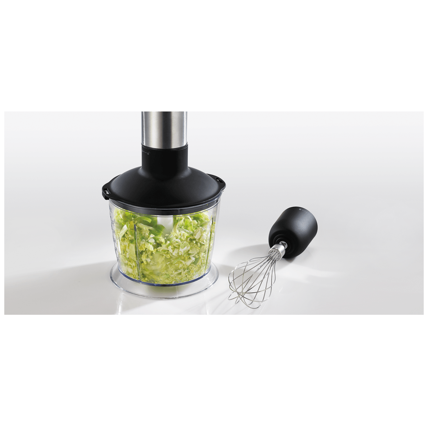 Štapni mikser, snaga motora 800 W, DC motor za ekonomičnu i dugotrajnu upotrebu, jednostavno čišćenje, uključivanje na gumb, regulacija brzine, trenutno djelovanje, bijeli indikator rada za potpunu kontrolu, pričvršećeno šarafom, jednostavna upotreba, pogodan za pravljenje kaša, nastavci štapnog miksera: sjeckalica sa posudom, metalni dodatak za sjeckanje, posuda za miješanje, stalak, setlica za tučenje, kapacitet posude za miješanje 0,5 lit., zapremina posude sjeckalice 0,5 lit., mjerna posuda, mjerna posuda s poklopcem, pogodna za čuvanje hrane, gumirana podloga protiv klizanja, učinkovita četverostruka oštrica, materijal kućišta plastika i metal, boja crna, dužina priključnog kabla 1.3 met.