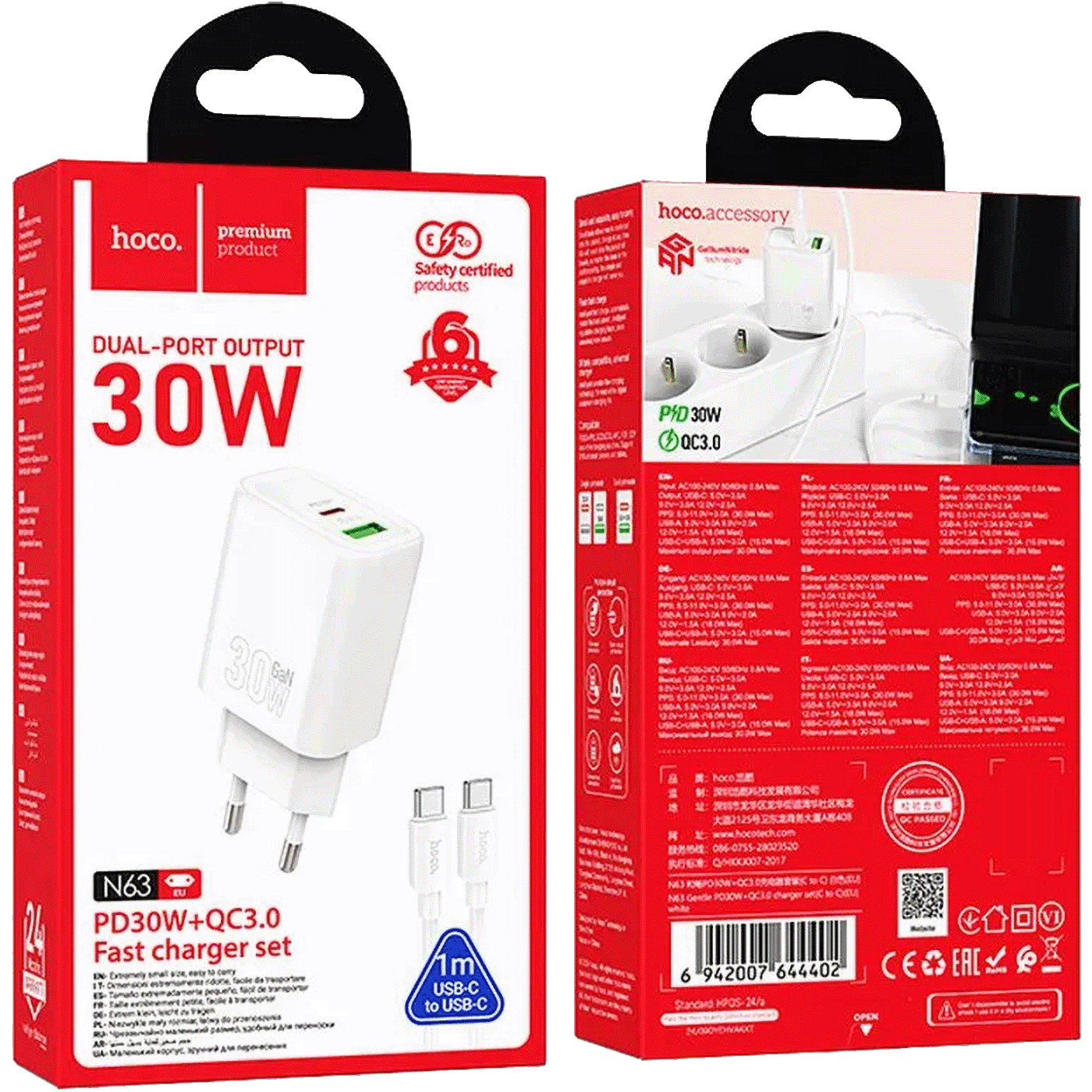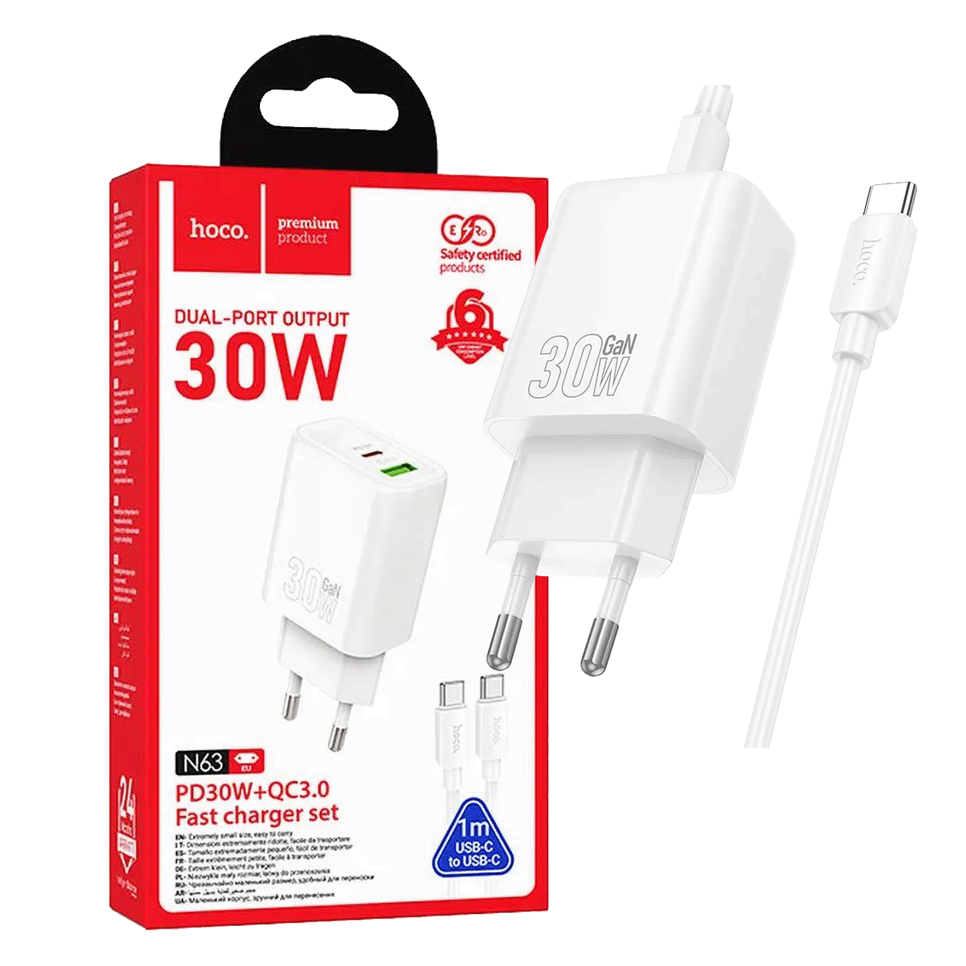 Hoco N63 zidni punjač s funkcijom brzog punjenja i dvostrukim izlazom. Omogućuje brzo punjenje mobilnih uređaja. Uključeno s 1-metarskim USB -C – USB -C kabelom.
