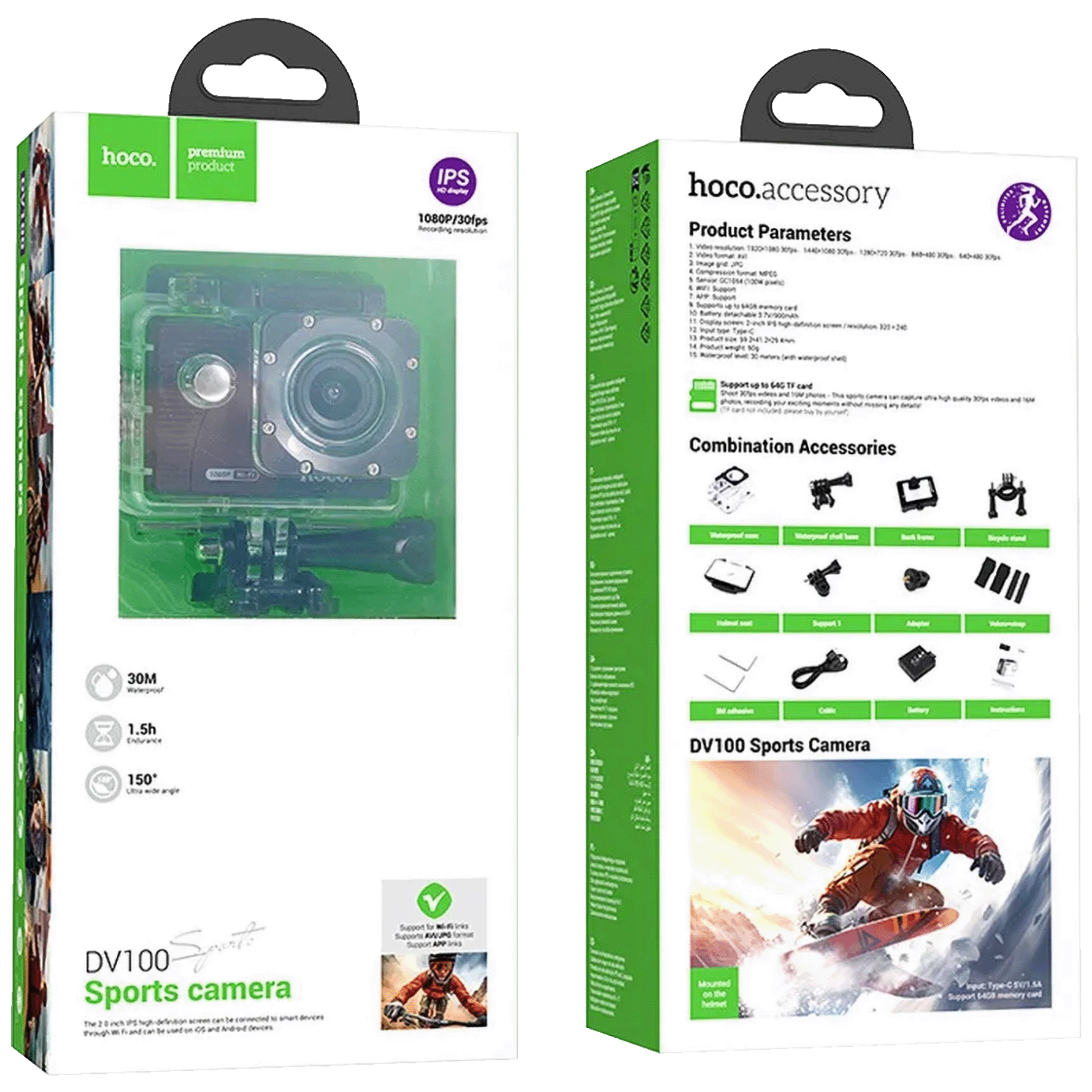 Sportska kamera Hoco DV100 savršeno je rješenje za ljubitelje tjelesnih aktivnosti i avantura na otvorenom. Opremljena 2-inčnim IPS HD zaslonom i naprednim GC1054 senzorom, ova kamera vam omogućuje snimanje 1080P videa visoke rezolucije pri 30 sličica u sekundi. Uz Wi-Fi podršku i namjensku mobilnu aplikaciju, kamera nudi jednostavno rukovanje i pristup snimljenim materijalima s bilo kojeg mjesta. Osim toga, uz njegovu pomoć možete dijeliti svoje avanture u stvarnom vremenu.