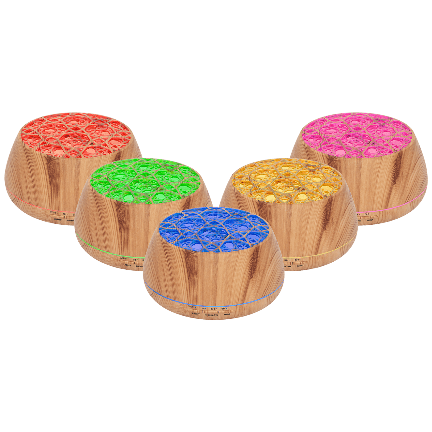 Ultrazvučni aroma difuzor ovlaživač zraka sa svjetlom, neprekidno ili povremeno vlaženje ( 30 sec ON / 30 sec OFF ), LED indikator, rasvjeta koja se može koristiti samostalno ili kontinuirana promjena boje svjela, spremnik vode 400 ml, mogućnost dodavanja mirisnih ulja za ugodniju atmosferu, ovlaživanje 23 – 70 ml/h, dimenzije ∅178 x 97 mm, adapter za napajanje uključen u pakiranje, pribor čaša sa mjericom