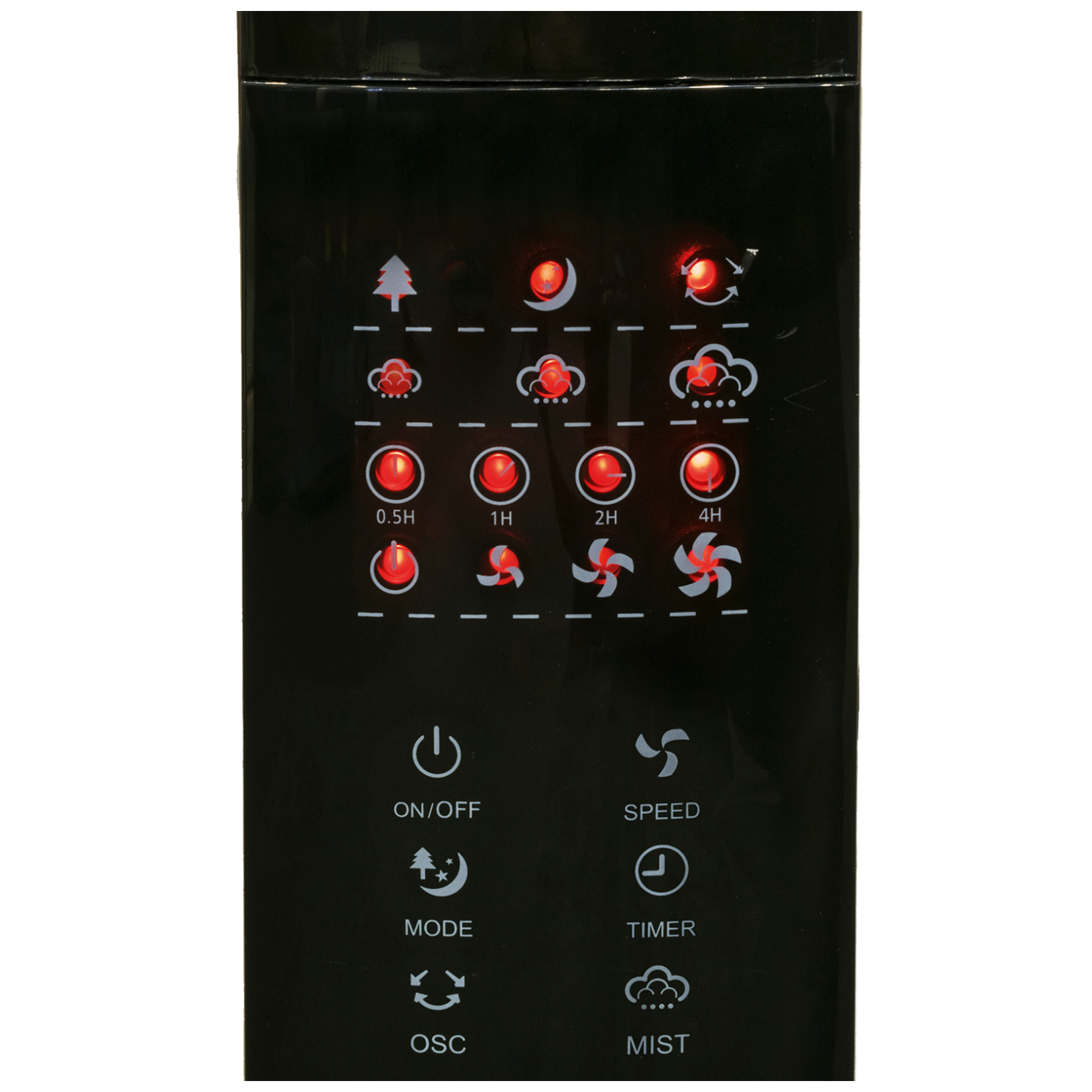 Upravlja se na dodir ili daljinskim upravljačem, a sadrži tri stupnja brzine i raspršivanje, ovlaživanje 250 ml/h, te timer do 7.5 sati za automatsko isključivanje, promjer lopatica 40 cm, oscilacija 75°, kapacitet spremnika za vodu 3 lit, točkići za lakše pomjeranje