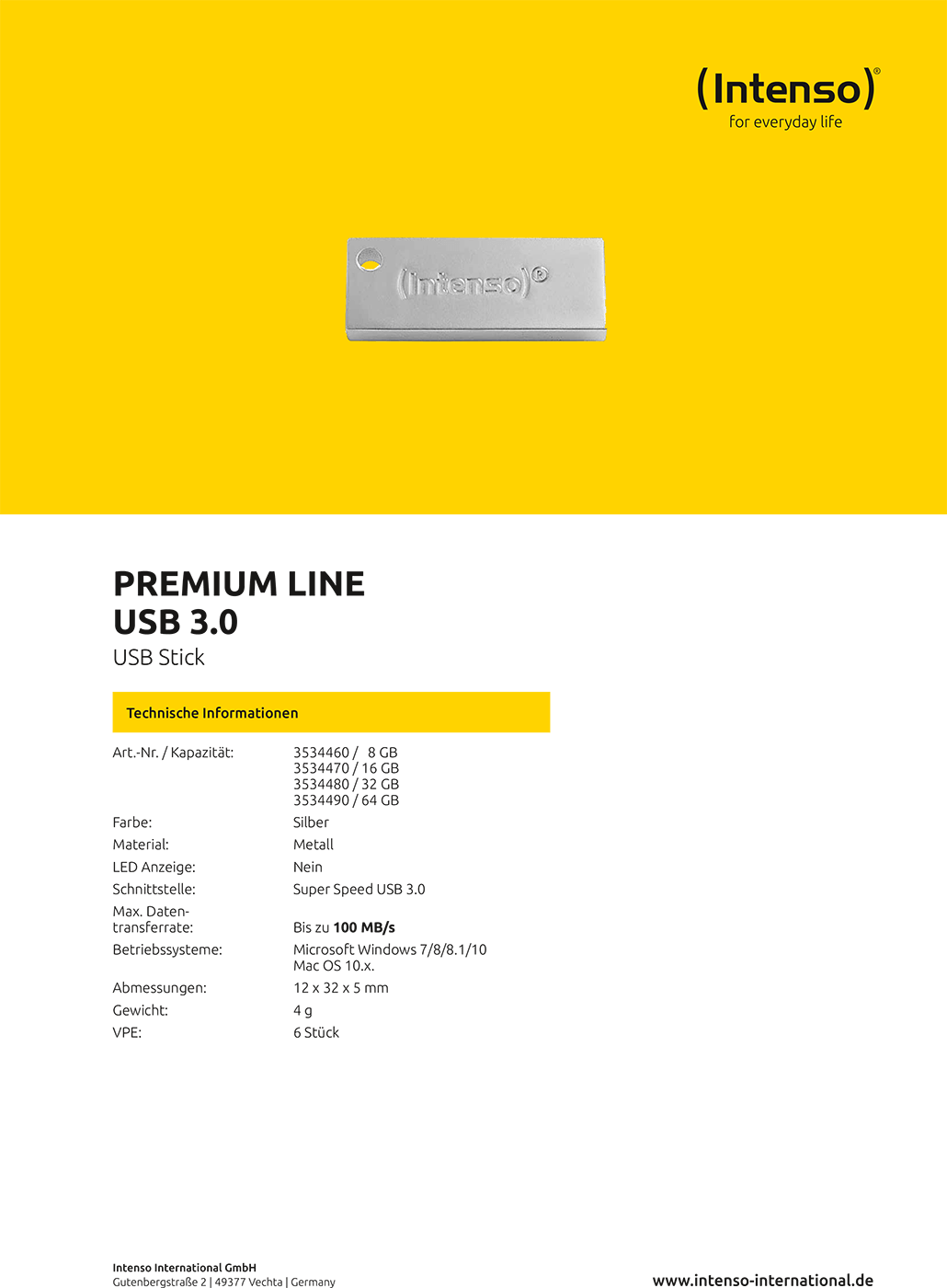 (Intenso) USB Flash 64GB Hi-Speed USB 3.0 up to 100MB/s, Premium Line – USB3.0-64GB/Premium Line