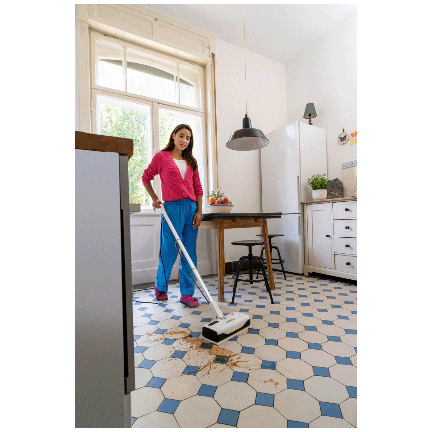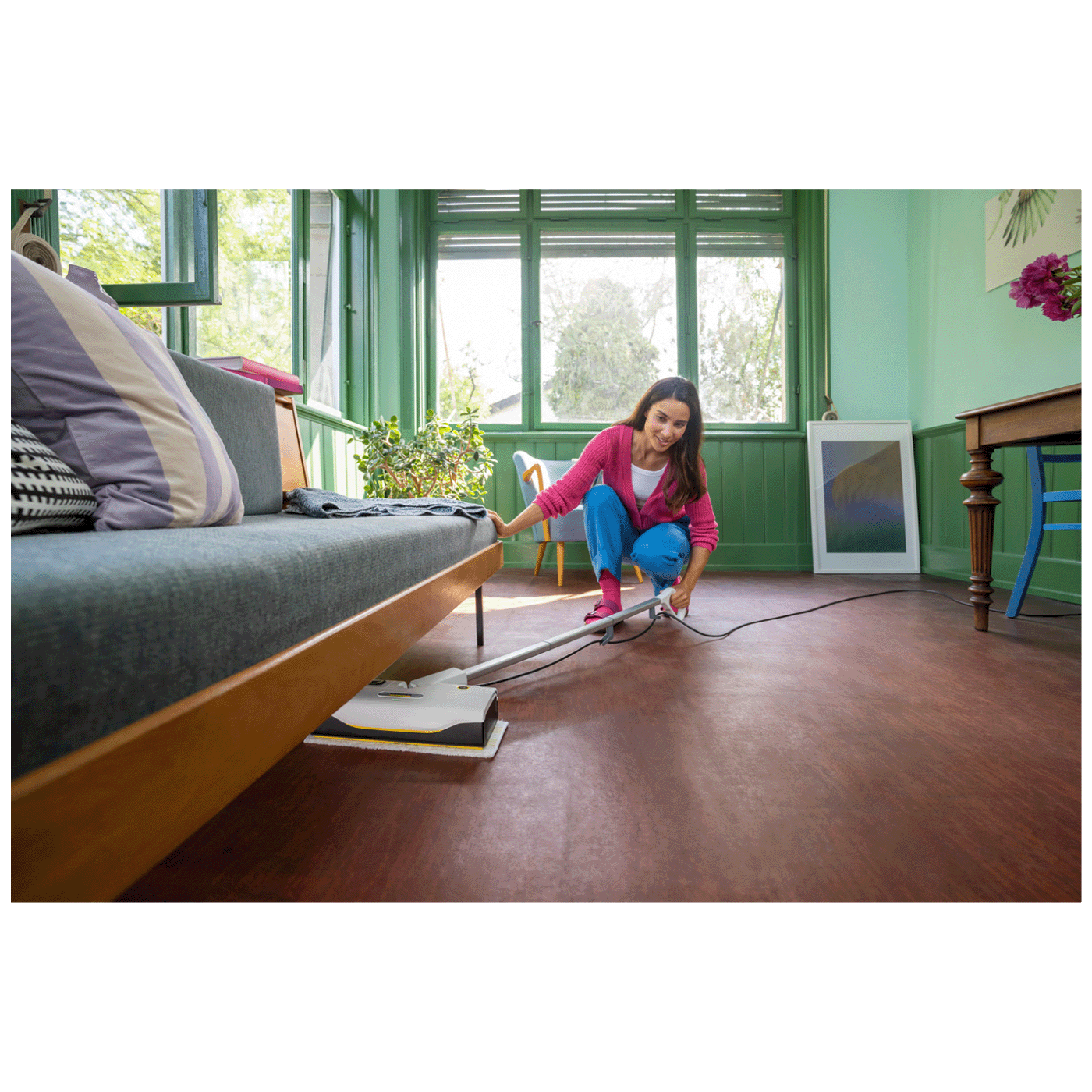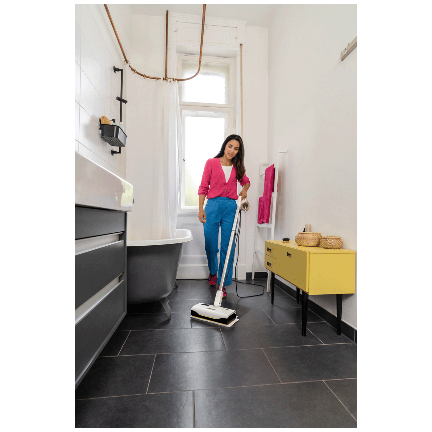 Kärcher SC 1 Upright je lagan i kompaktan parni čistač s uspravnim dizajnom koji omogućava brzo i praktično čišćenje tvrdo zaptivenih podova poput parketa, laminata, pločica ili PVC-a bez upotrebe hemikalija – samo uz vodenu paru. Uređaj se zagrijava i postaje spreman za rad za samo oko 30 sekundi, što ga čini idealnim za brze i efikasne svakodnevne čišćenje u domu. Integrirana kartuša za automatsko uklanjanje kamenca osigurava da uređaj radi pouzdano i dugo, a zahvaljujući ergonomskom zglobu mlaznice i lako uklonjivom spremniku za vodu, čišćenje je praktično i bez dodatnih komplikacija. Parni čistač također uklanja do 99,999 % virusa i 99,99 % uobičajenih bakterija s glatkih površina pri pravilnoj upotrebi.