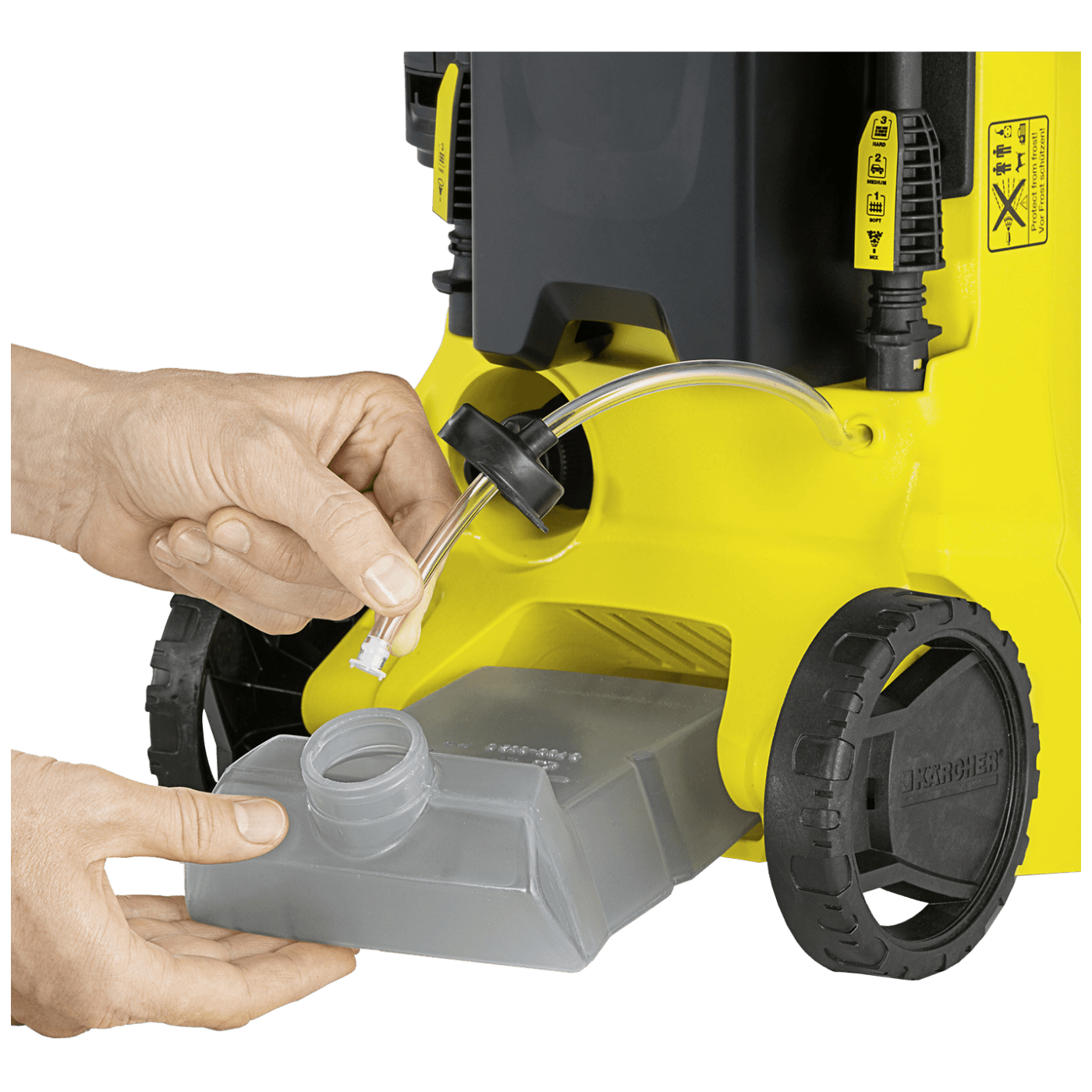 Promjena pritiska u modu sredstva za čišćenje moguća je bez zamjene mlazne cijevi. Zahvaljujući teleskopskoj dršci s namještanjem po visini uređaj se praktično izvlači i kompaktno skladišti.