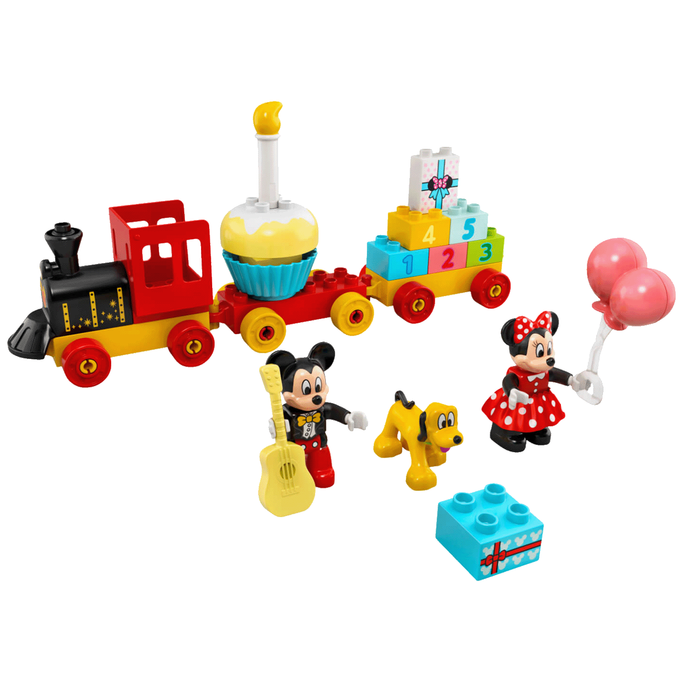 • Sadrži legendarne Disneyjeve likove Mickeyja Mousea, Minnie Mouse i Pluta, trodijelni vozić za slaganje, rođendansku tortu sa svijećom za slaganje, 5 kocaka s brojevima koje se mogu složiti jedna na drugu i dodatke.