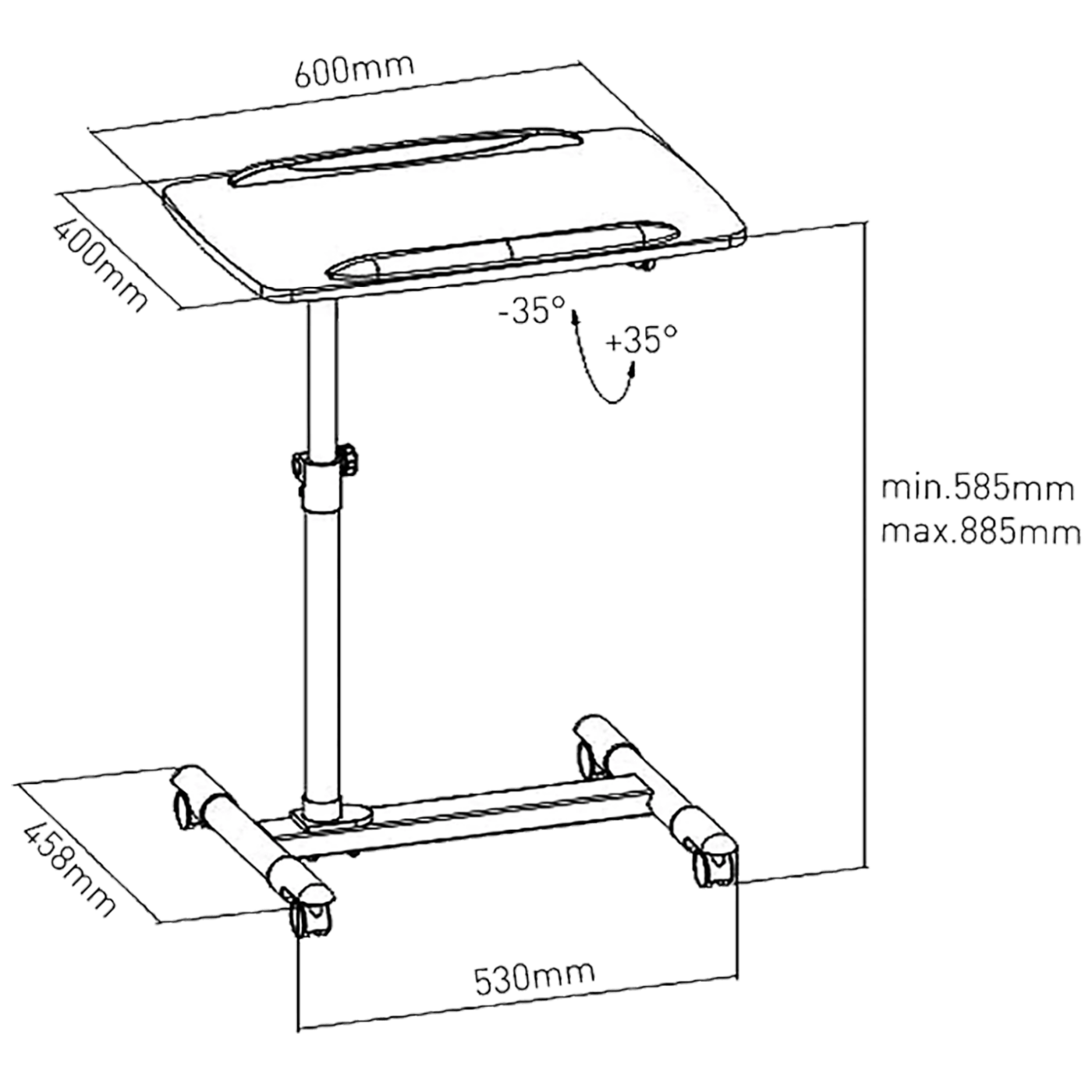 Podešavanje visine 585 – 885 mm, podešavanje nagiba 35° do -35°, kotači sa nosačima, obostrana zaštita od pada