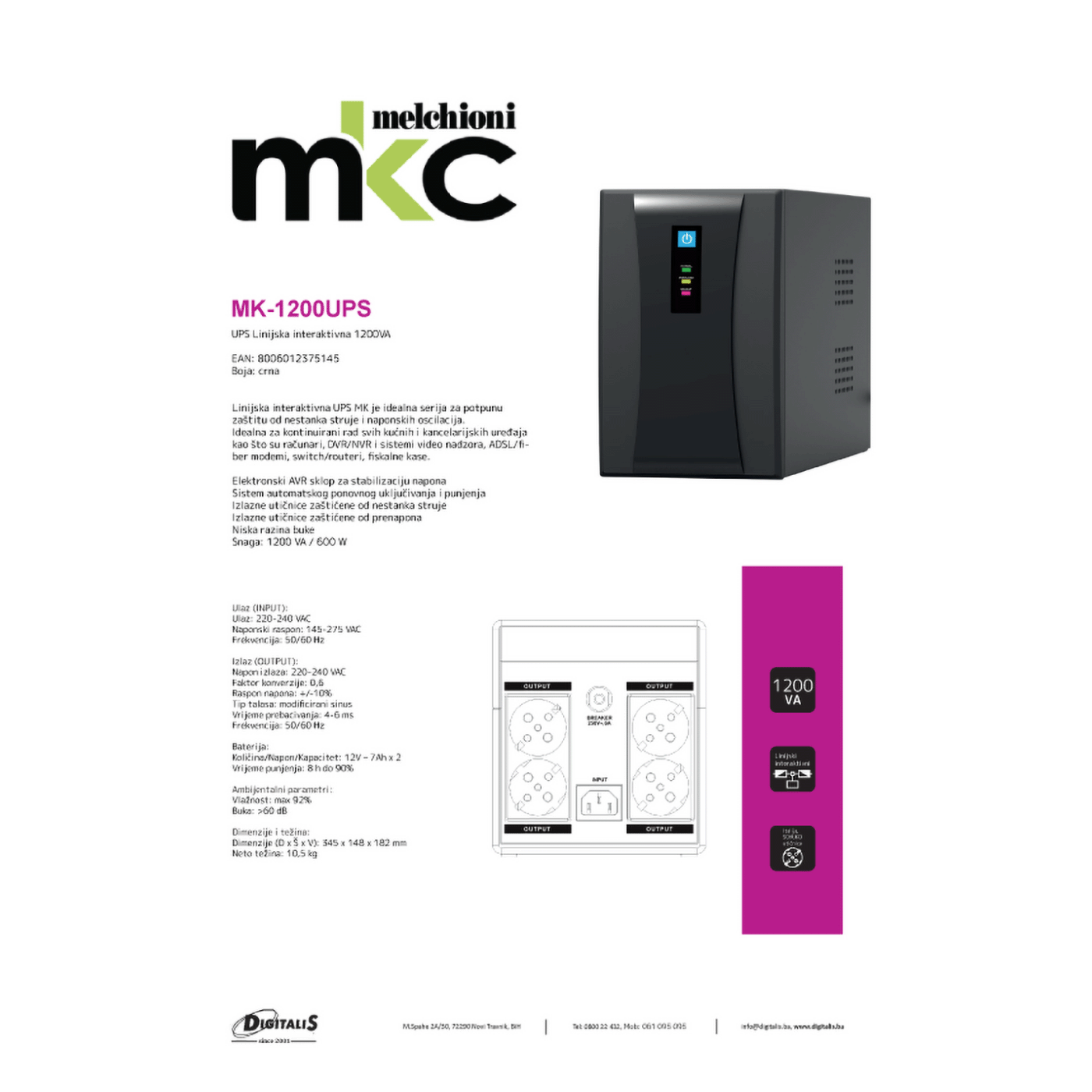 MK-1200UPS je line-interactive UPS namijenjen zaštiti računara, mrežne opreme i drugih uređaja u kućnim ili kancelarijskim okruženjima. Opremeljena automatskom regulacijom napona (AVR – boost/buck), štiti od prenapona, potpora i nestabilnosti napona, osiguravajući stabilan rad i u vremenski nepredvidivim okolnostima.