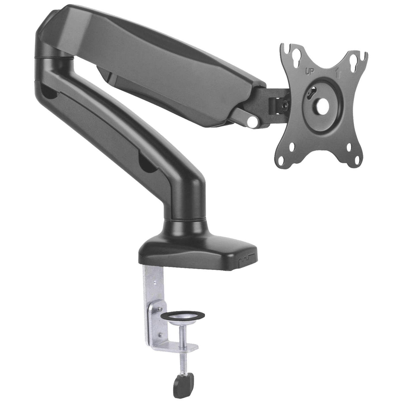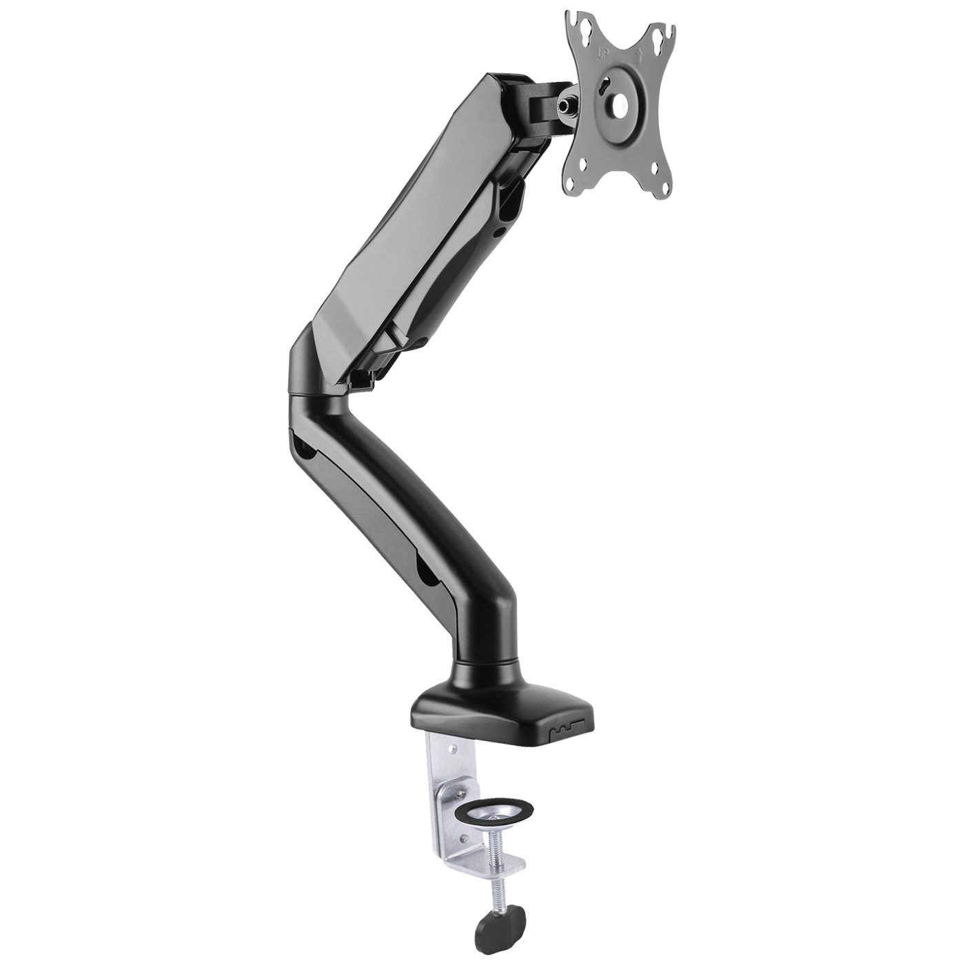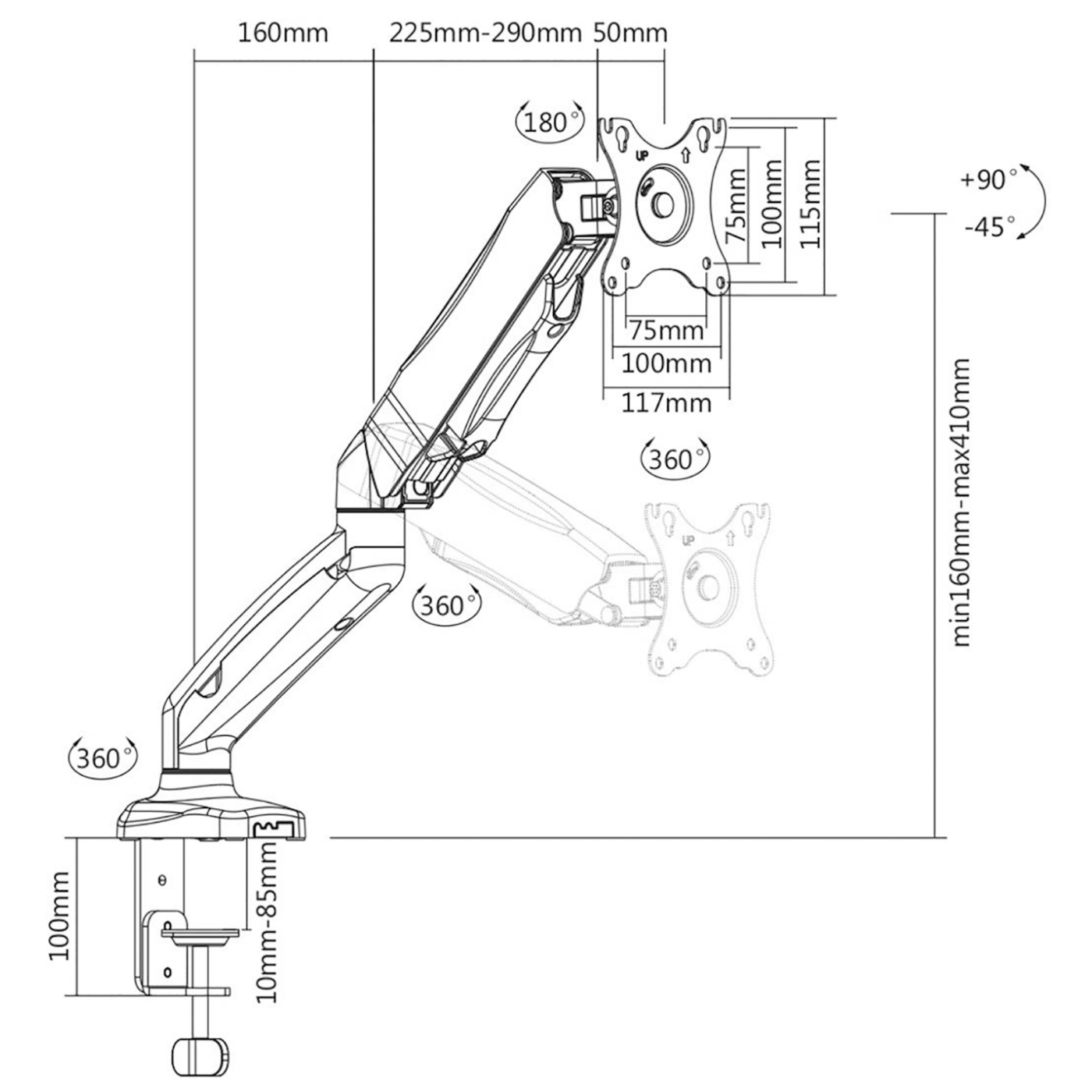 Stolni nosač za LCD monitor, veličine ekrana 13 – 27″, nosivost 2 – 6.5 kg, VESA: 75 x 75, 100 x 100, nagib + 90° / -45°, rotacija 360°, stezaljka za montažu ( 10 – 85 mm ), ploča adapter za fiksnu montažu, integrirana plinska opruga za glatko okomito podešavanje zaslona (maks. do 250 mm), pribor za montažu