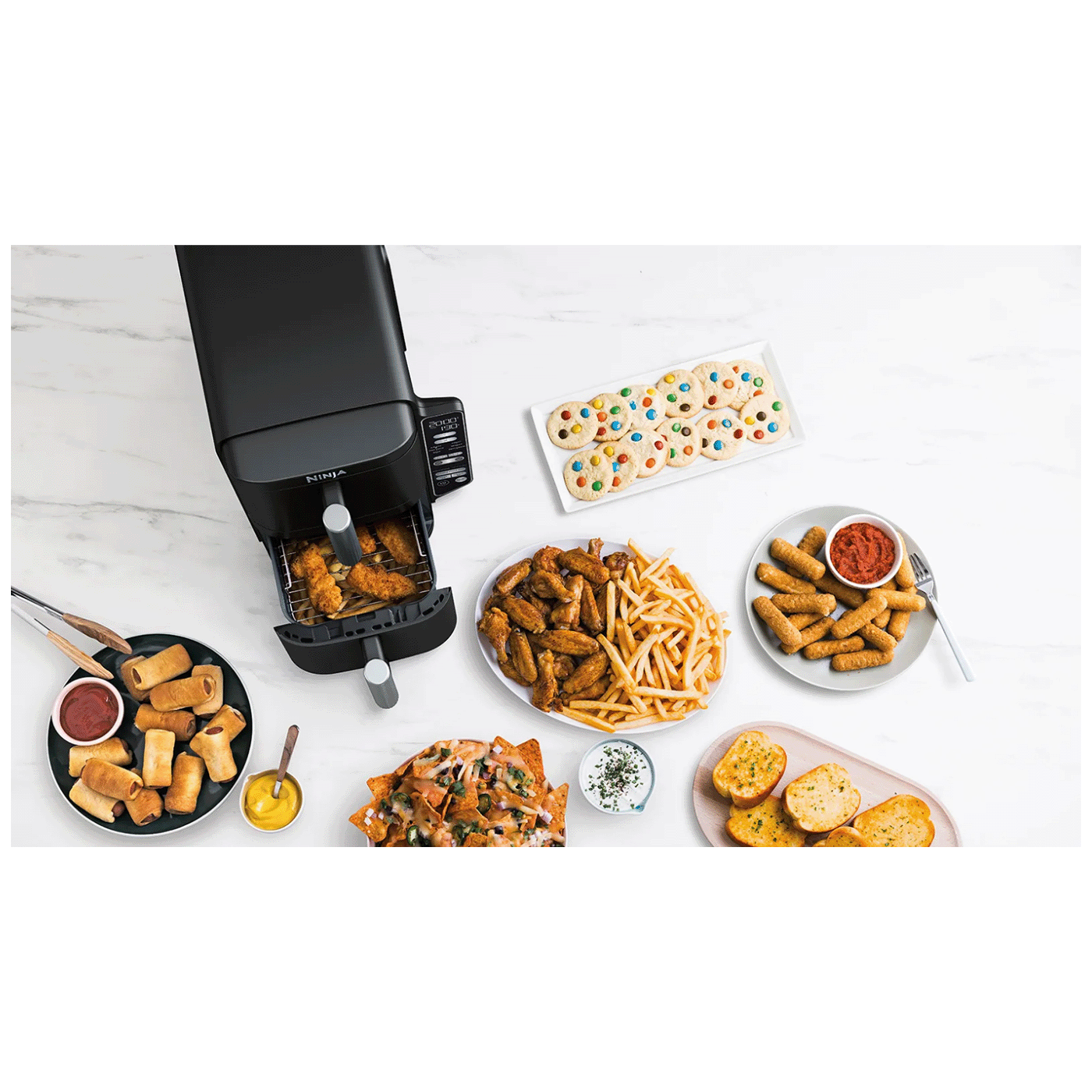 Kombinirajte različite funkcije kuhanja, vremena i temperature u svakoj ladici. Funkcija SYNC osigurava da obje ladice završe kuhanje u isto vrijeme – tako da možete zajedno uživati ​​u svježe pripremljenim glavnim jelima i prilozima ili poslužiti švedski stol za zabavu sa svježe pripremljenom hranom.