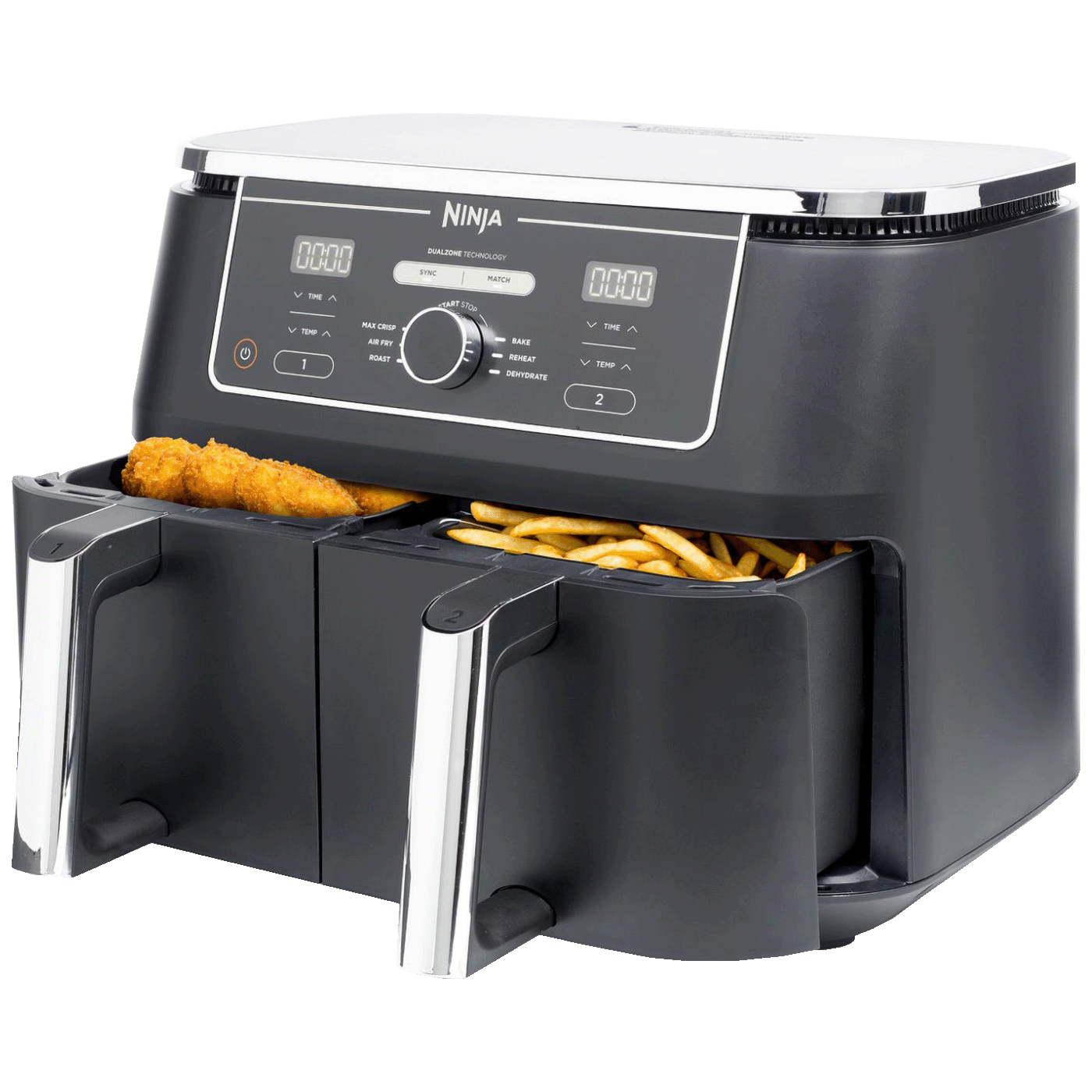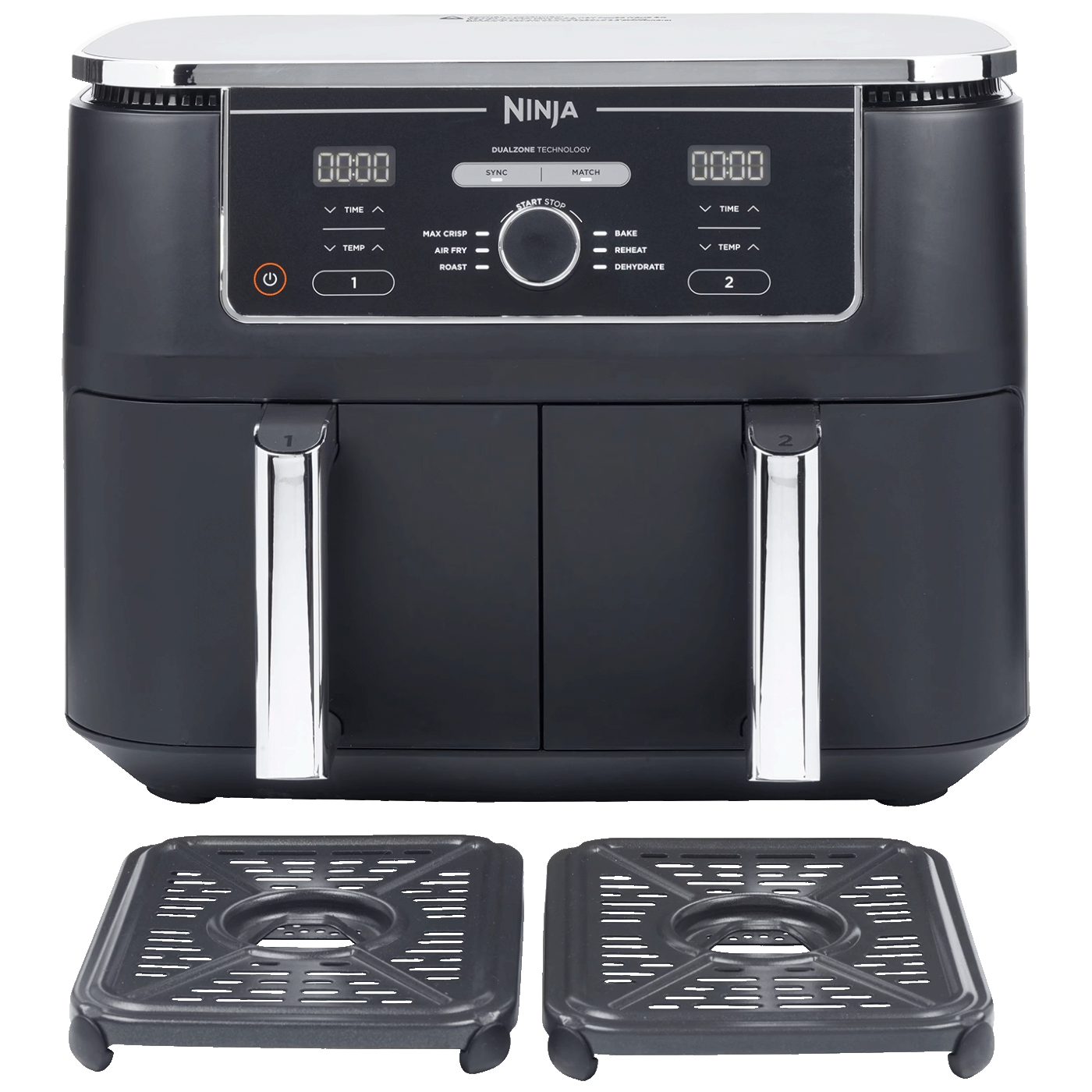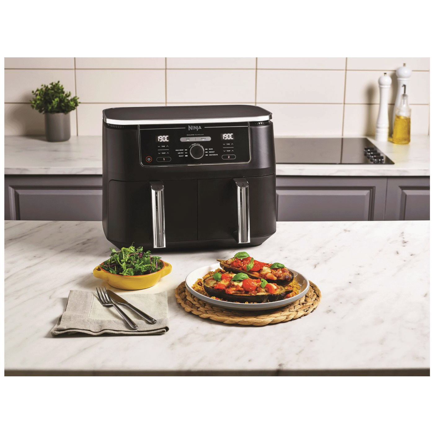 Kad kuhate, sve je u dobrom trenutku. Idealno za obitelji i velika kućanstva: Ninja Foodi MAX Dual Zone 9,5 l friteza na vrući zrak brine se o planiranju vremena umjesto vas. Koristite funkciju SYNC za pripremu dva različita jela s različitim temperaturama, vremenima i postavkama u dva odvojena odjeljka, tako da sve bude spremno za posluživanje u isto vrijeme! Kuhate li za cijelu obitelj? Pomoću funkcije MATCH možete koristiti iste postavke na oba polja za kuhanje i tako dobiti dvostruko veću količinu u isto vrijeme!