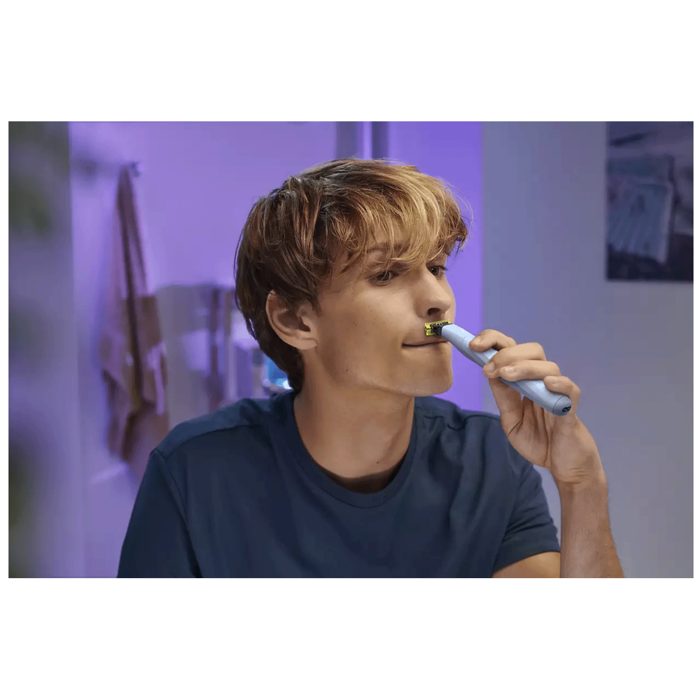 OneBlade prati konture lica, omogućavajući lako i ugodno brijanje svih dijelova lica. Dvostrana oštrica omogućava oblikovanje rubova i jasnih linija pomicanjem oštrice u bilo kojem smjeru.