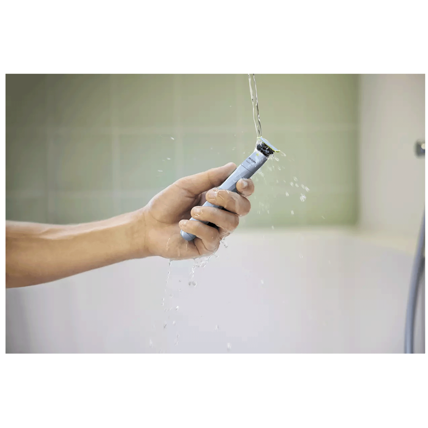 OneBlade potpuno je vodootporan pa se lako čisti: samo ga isperite pod mlazom vode. Možete brijati mokru ili suhu kožu, čak i pod tušem – kako god preferirate. Pjena za brijanje nije potrebna.