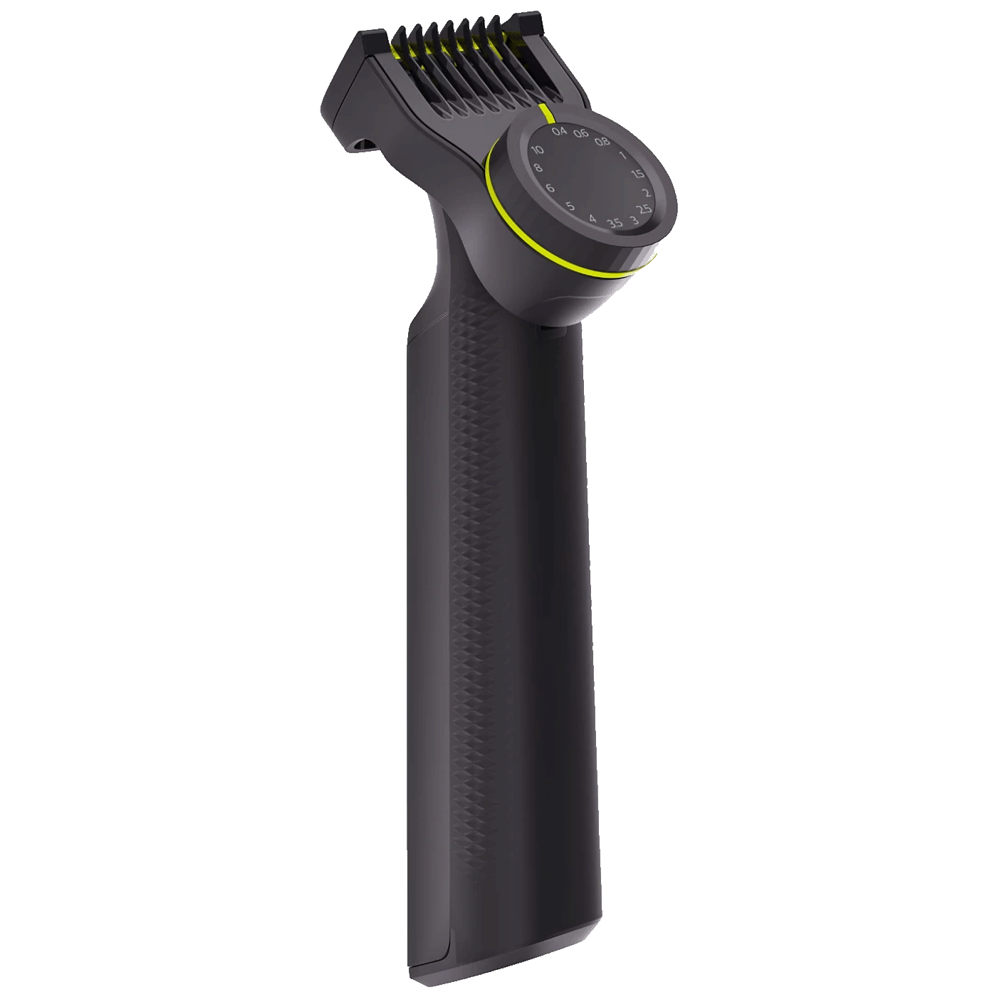 Philips OneBlade ima revolucionarnu tehnologiju za dotjerivanje dlačica na tijelu. Može brijati bilo koju duljinu dlačica. Njegov dvostruki zaštitni sustav – premaz za bolje klizenje u kombinaciji sa zaobljenim vrhovima – olakšava brijanje te ga čini ugodnijim. Njegova tehnologija brijanja obuhvaća rezač koji se brzo pomiče (12 000x u minuti), tako da je učinkovit čak i na duljim dlačicama.