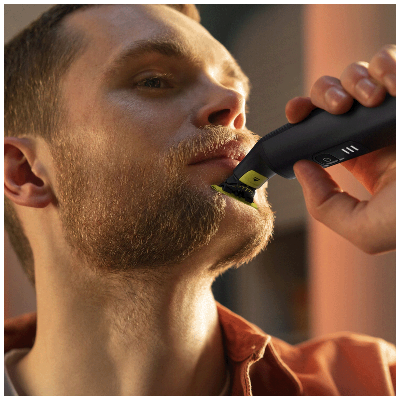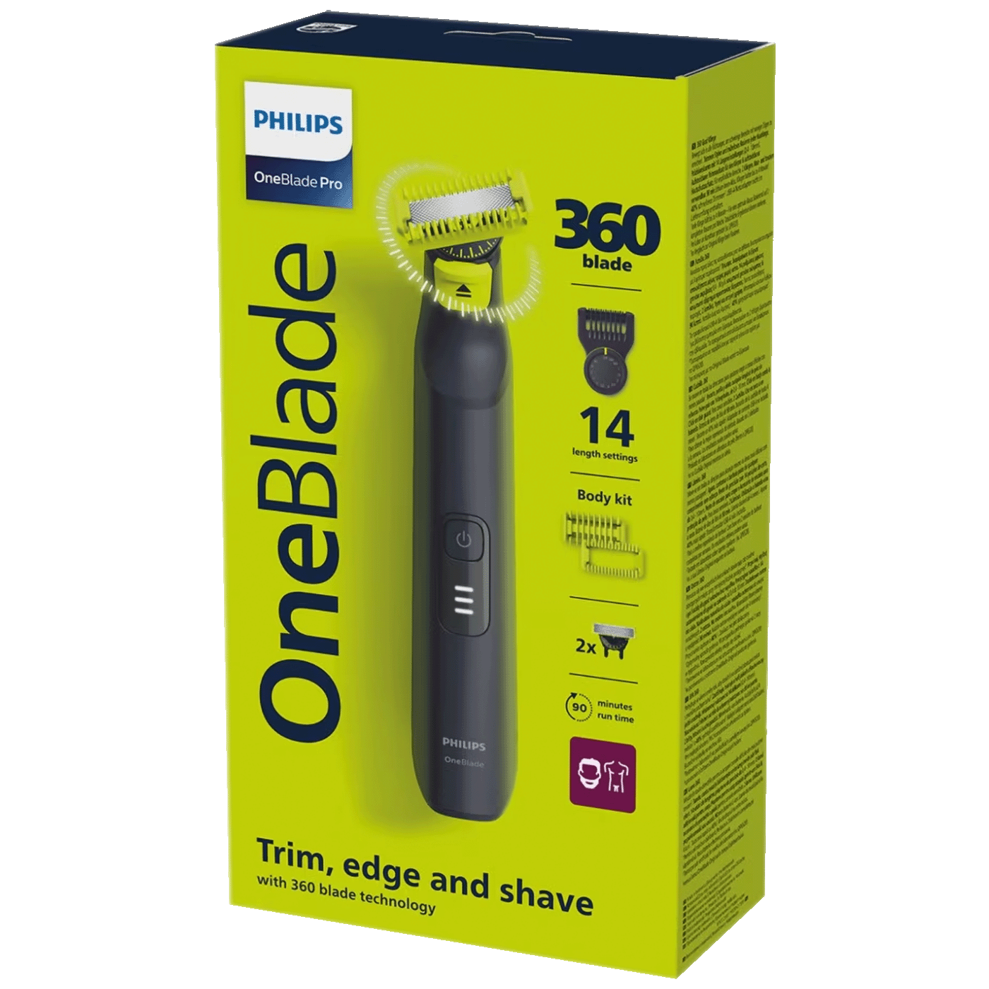 Philips OneBlade Pro Face + Body podrezuje, oblikuje i brije dlačice bilo koje duljine. Sadrži jednu oštricu za lice i jednu sa štitnikom za kožu za dlačice na tijelu. Zaboravite na uporabu više alata. OneBlade radi sve.
