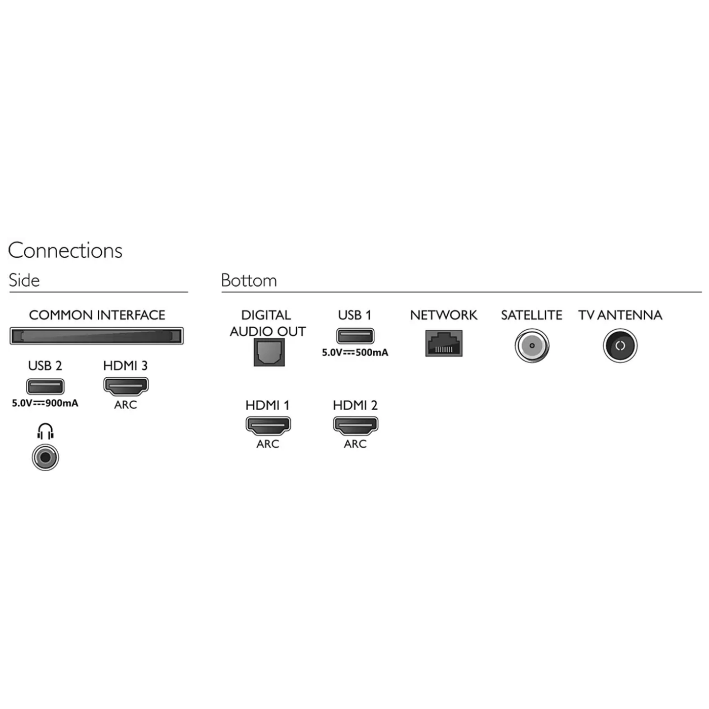 Povezivost: HDMI x 3, USB x 2, WiFi 802.11 n, satelitski priključak, CI+, digitalni audioizlaz ( optički ), LAN- RJ-45 , izlaz za slušalice, setvisni priključak.