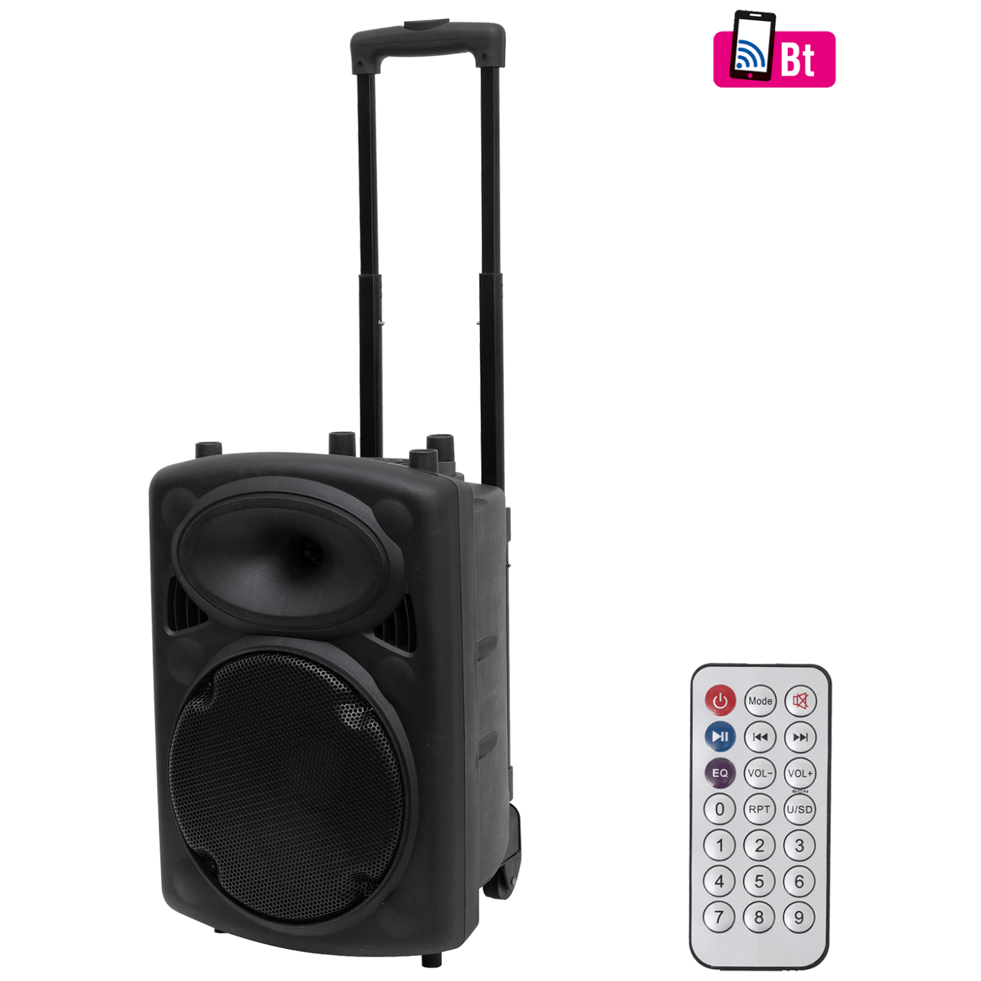 Portable prijenosni zvučnik, bežična Bluetooth veza, slušajte glazbu s mobilnog uređaja, računala, MP3 / WMA reprodukcija s USB uređaja/ microSD memorijskih kartica, FM radio sa automatskom pretragom, bežični mikrofon sa eho efektom, KARAOKE funkcija, ugrađeno pojačalo