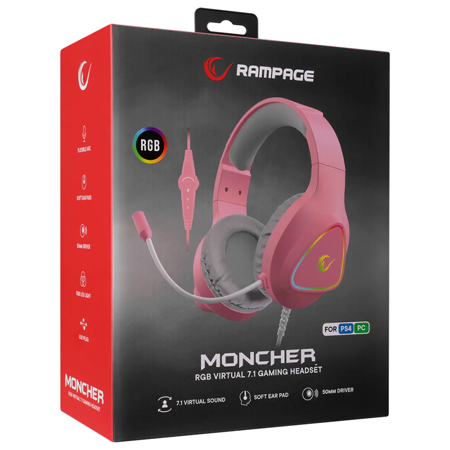 Slušalice sa mikrofonom gaming RAMPAGE M7 MONCHER pink, RGB LED, USB 7.1
