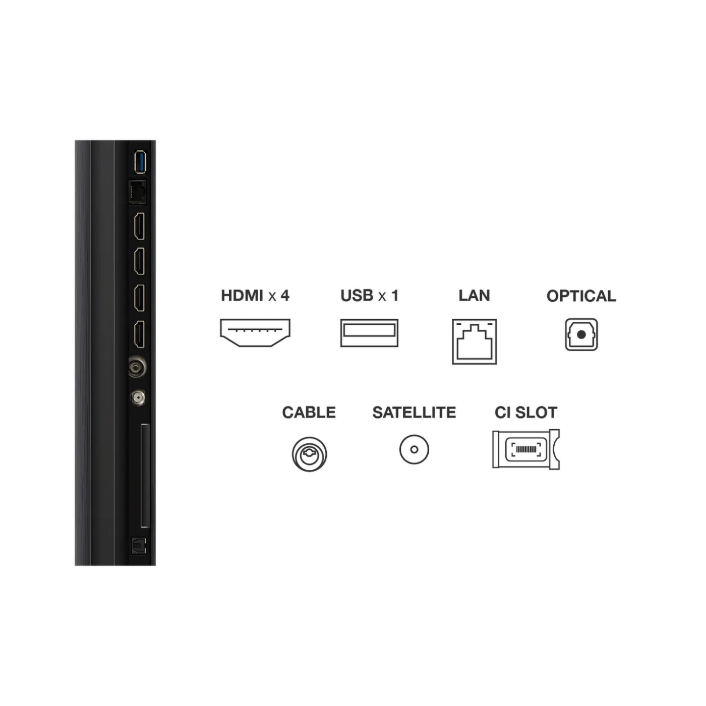 Njegov QLED ekran s Mini LED pozadinskim osvjetljenjem koristi precizno zoniranje svjetla (do 512 zona lokalnog zatamnjivanja) za visoki kontrast, jasne tamne nijanse i briljantne boje. Procesor slike AiPQ Pro, uz podršku za HDR formate (Dolby Vision IQ, HDR10+, HLG), omogućava bogatu reprodukciju boja i detaljnu sliku, dok 4K rezolucija i visoka frekvencija osvježenja (144 Hz) pružaju glatki prikaz pokreta — naročito značajno kod sporta i igrica. Štaviše, ovaj model dolazi s kvalitetnim ONKYO 2.1 zvučnim sistemom podržanim Dolby Atmos-om, što doprinosi punom i prožimajućem audio-vizualnom doživljaju.