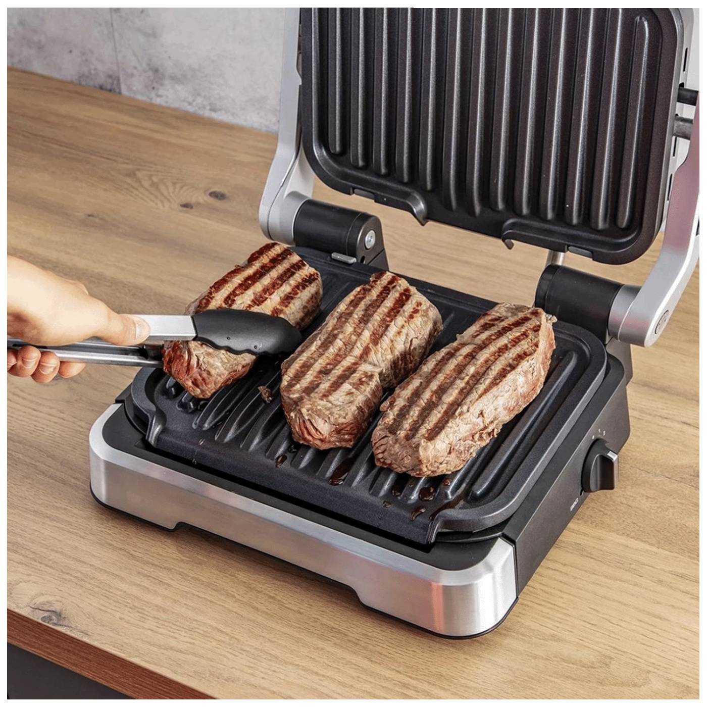 OptiGrill 2u1 mjeri debljinu vaše hrane do milimetra, uzima u obzir broj komada i automatski prilagođava vrijeme kuhanja—garantira savršene rezultate, od rijetkih do dobro pečenih!