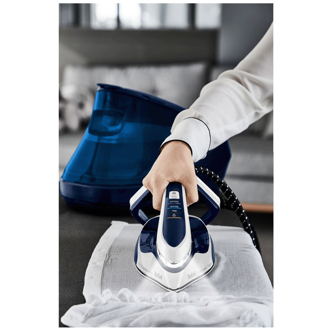 Pegla sa parnom postajom, Tefal Pro Express Vision, snaga 3000W, dodatni udar pare 180 g/min., udar pare 700 g/min., pritisak pare 8.1 bar., vertikalni udar pare, 3 elektronske postavke pare i temperature, vrijeme zagrijavanja 2 min.
