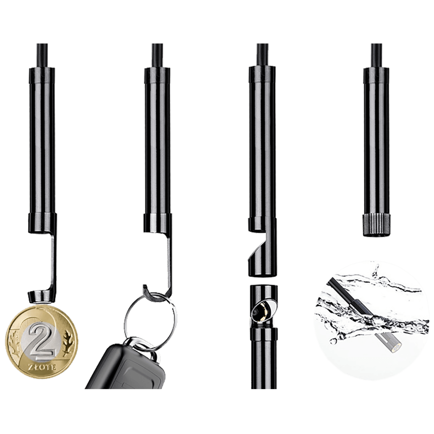 Skup zamjenjivih vrhova (kuka, magnet, ogledalo) omogućit će vam ne samo pregled, već i hvatanje predmeta iz najužih kutaka, a zaštitna kapica omogućit će vam da koristite leću pod vodom!