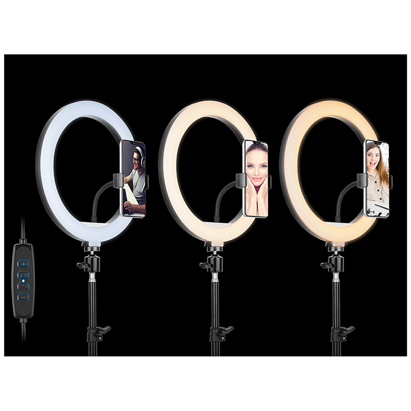 LED lampa sa postoljem, 160 LED dioda, temperatura svjetlosti od 2700 – 7000 K., hladna, topla, neutralna, svaka boja ima 10 razina intenziteta svjetlosti, što ukupno daje 30 različitih varijacija, snaga 14.5 W, 900 – 1700 lumena, fleksibilni držač telefona, napajanje USB kabelom dužine od 200 cm