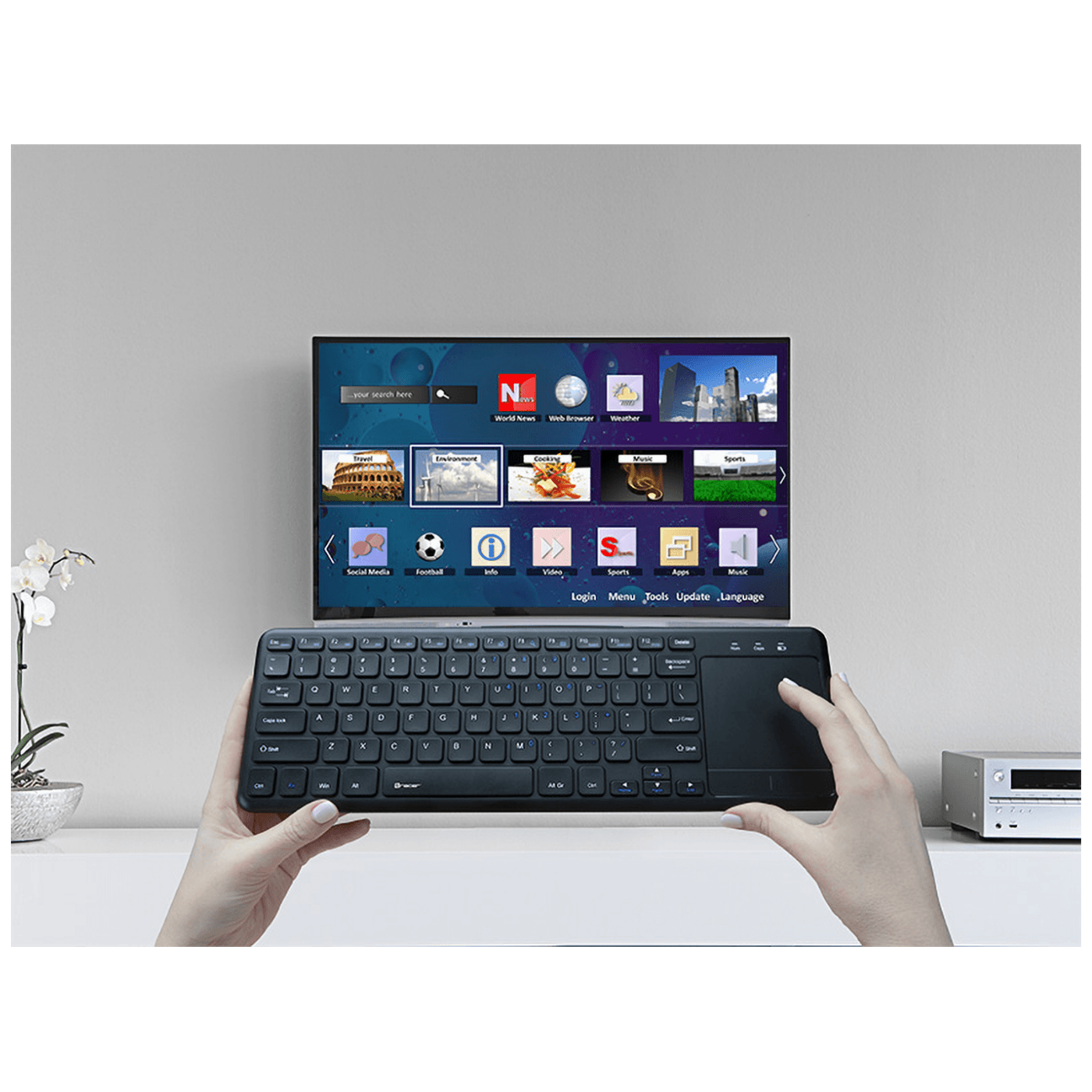 Panel osjetljiv na dodir s dvije velike tipke osigurava udobnost i preciznost rada, uspješno zamjenjujući miš. Upravljanje Smart TV-om, konzolom za video igre i drugim multimedijskim uređajima nikada nije bilo tako praktično.