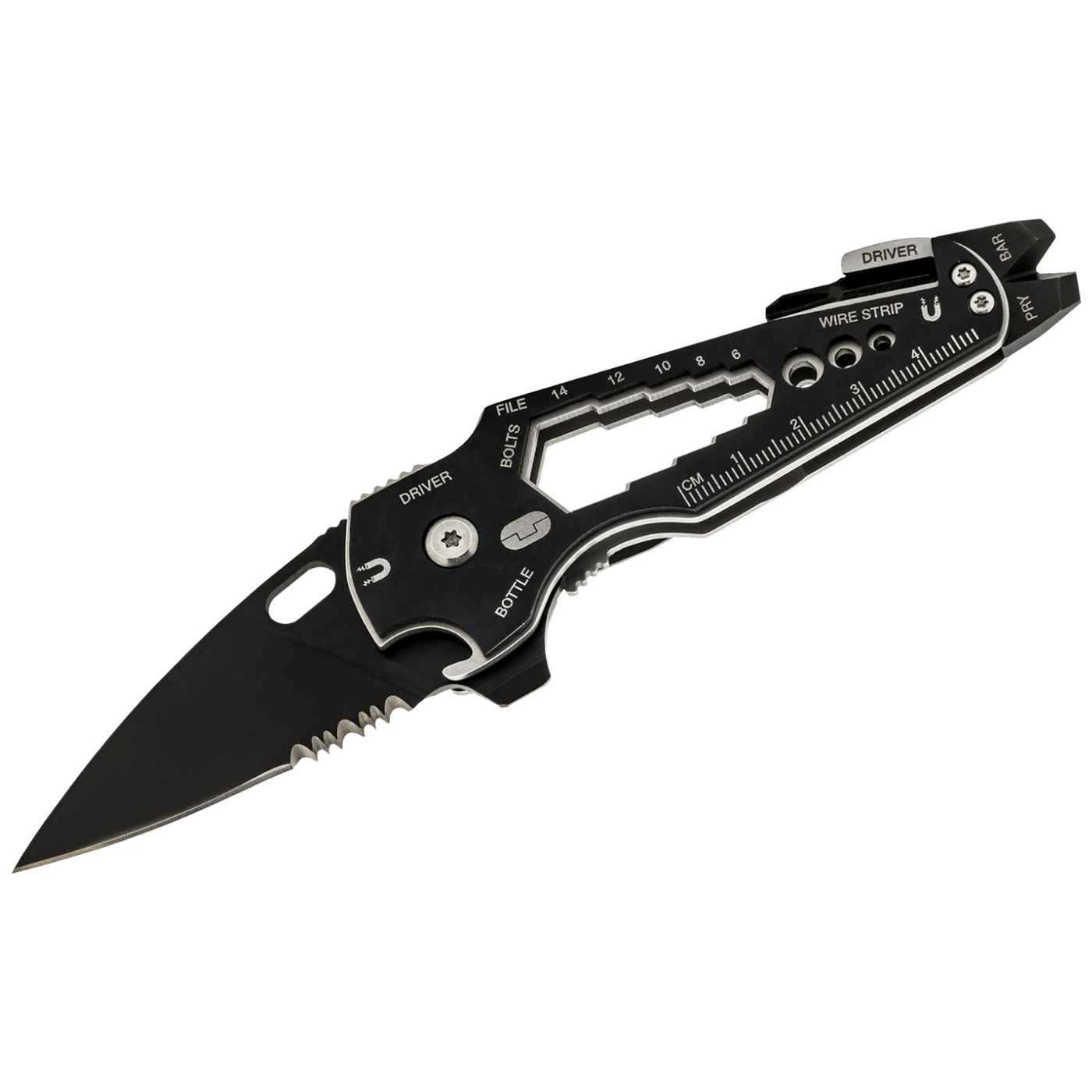 Višenamjenski džepni nož s 15 osnovnih alata: mali / srednji / veliki odvijač s ravnom glavom, ravnalo s anglosaksonskim i metričkim gradacijama, skidač kabela u tri veličine, ključ 6 mm / 8 mm / 10 mm / 12 mm / 14 mm, otvarač za boce, magnetizirana stezna glava 1/4 “, kopča za remen, zatezač, glava turpije, magnetska zvijezda bit glava