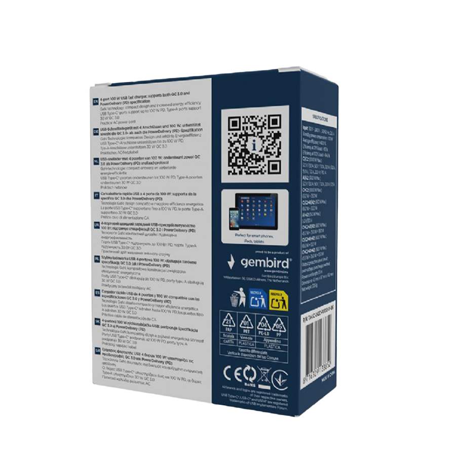 USB punjač 2xType-C + 2xUSB-A 4-port 100 W GaN USB PowerDelivery fast charger, black, GEMBIRD, TA-UC-2A2C-PD100-01-BK