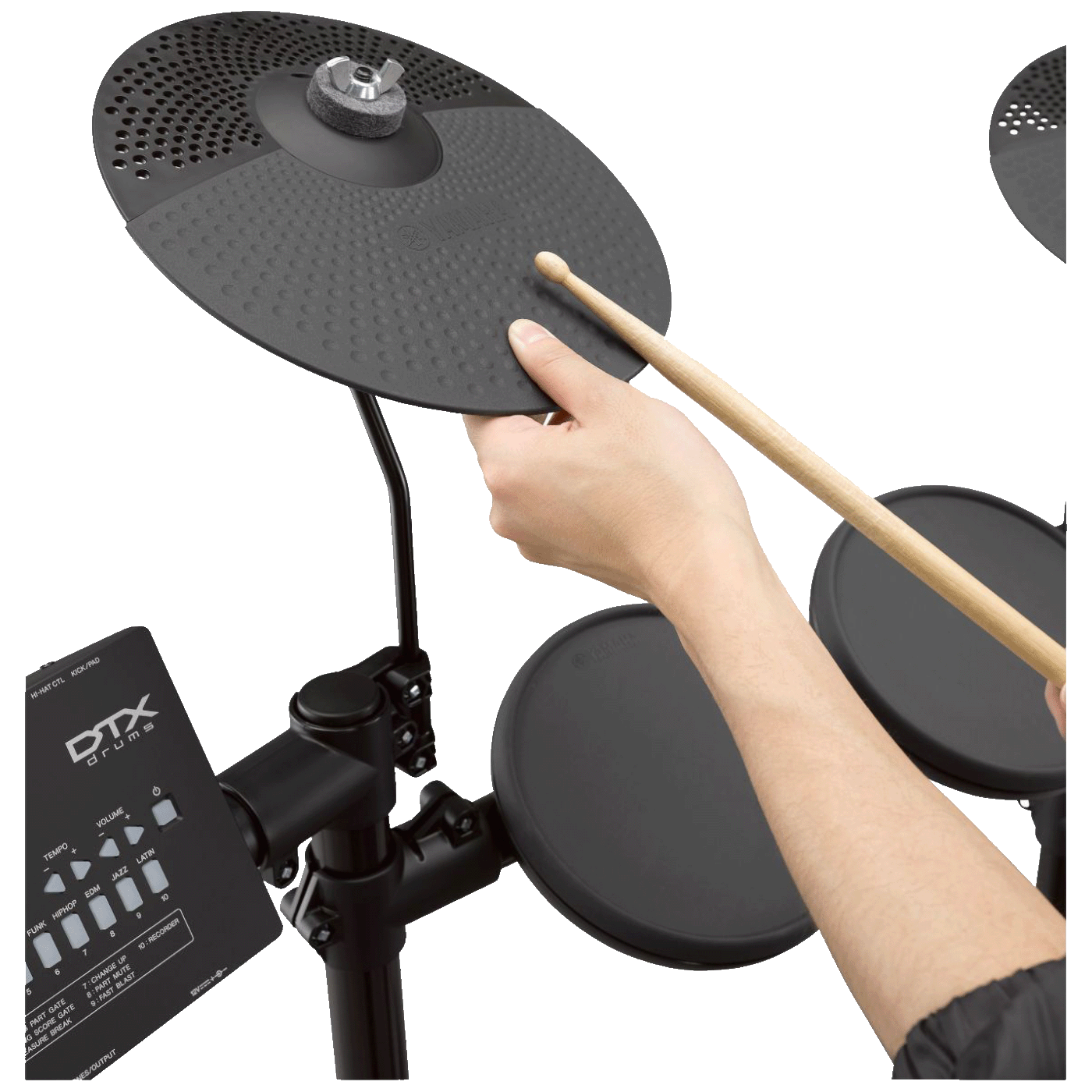 DTX dolazi s 10 ugrađenih funkcija vježbanja koje su moguće samo s elektroničkim bubnjem. To uključuje funkciju Pad Gate, prikladnu čak i za početnike, koja vas postupno uvježbava tijekom vremena, funkciju Rhythm Gate, koja potiče precizan osjećaj za ritam – temeljnu za bubnjanje, i funkciju Fast Blast, koja mjeri brzinu vaših udaraca . Postoji i funkcija bodovanja tako da možete objektivno procijeniti svoje vještine. Iskoristite ovaj kompletan niz funkcija podrške kako biste poboljšali svoju moć izražavanja kao bubnjar.