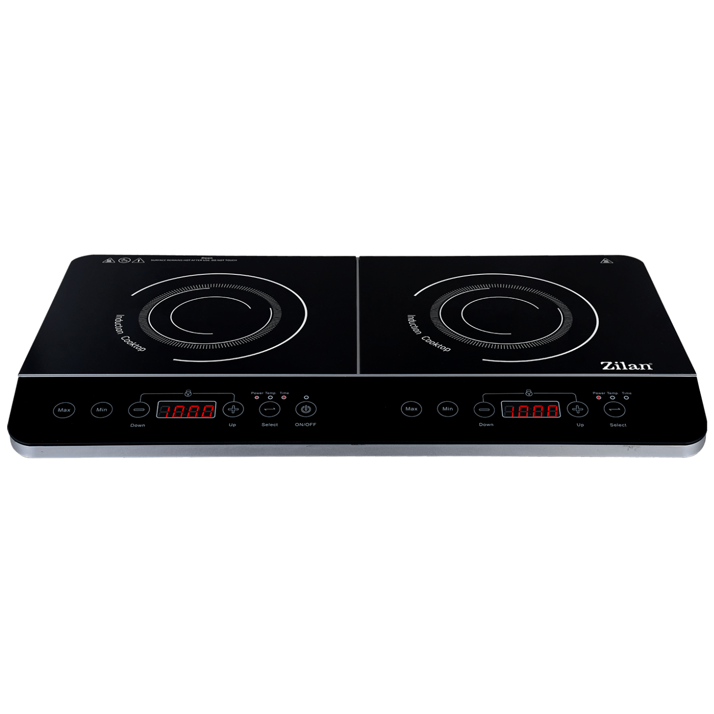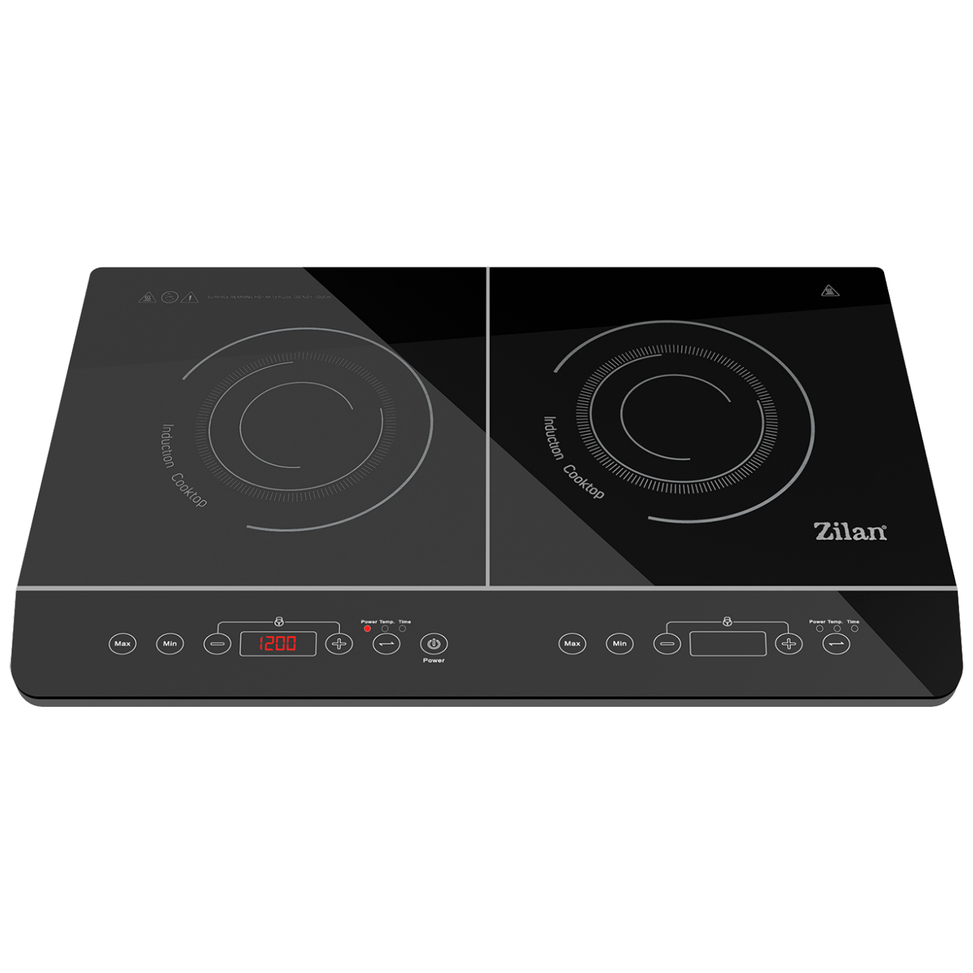 Indukcijsko kuhalo ZLN8088, dvije površine za kuhanje snage 2000 W (lijevo) / 1500 W (desno), površina za kuhanje prekrivena kristalnim staklom velike čvrstoće.