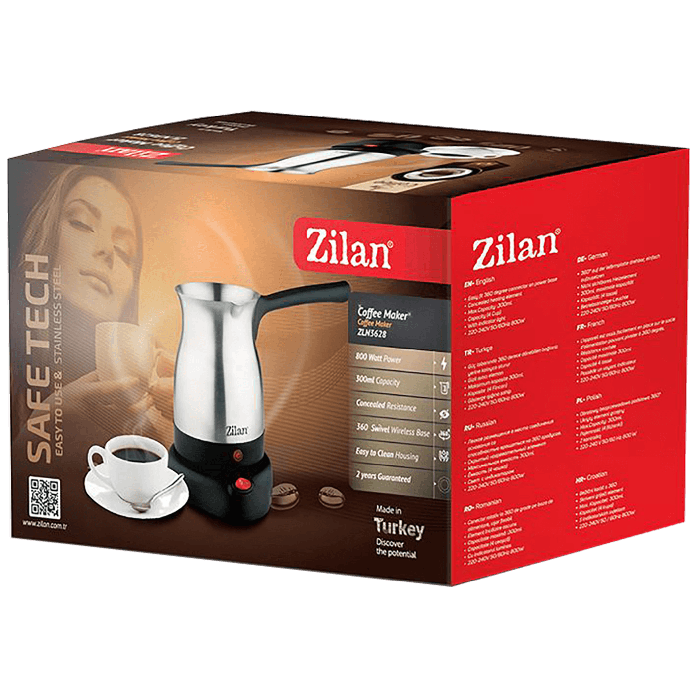 Kuhalo za tursku kavu, snaga 800W, zapremina posude 0,3l, priprema do 4 šalice kave, puna rotacija omogućava jednostavno rukovanje aparatom, nema zapetljavanja kabela, skriveni grijač, materijal izrade plastika i metal, indikator rada