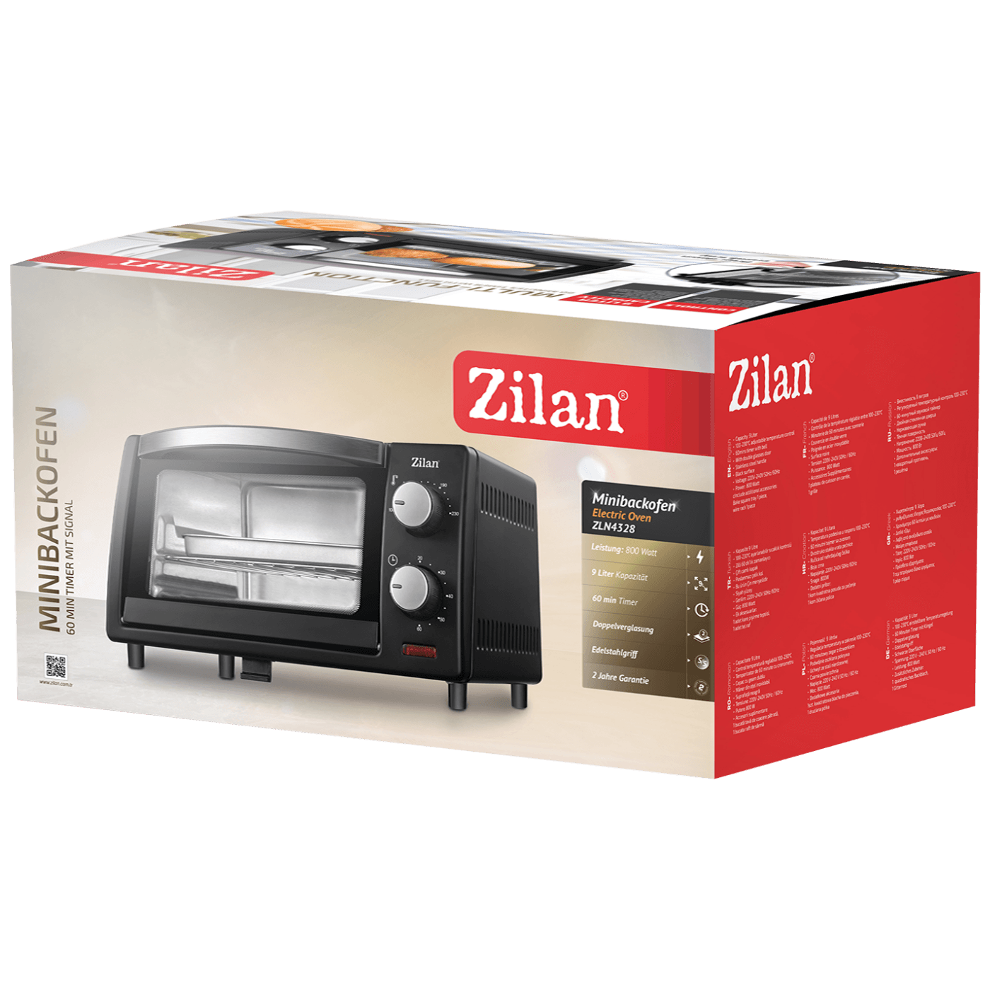 Mini pećnica Zilan, ZLN4328, snaga 800 W, unutarnj azapremina 9 lit., tajmer sa zvonom, dvostruko zastaklena vrata, 2 kvarcna grijača, ladica za mrvice, kromirana rešetka, 1 četvrtasti pleh